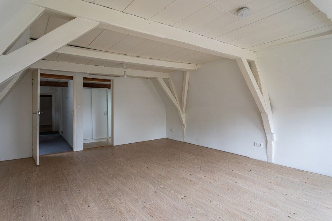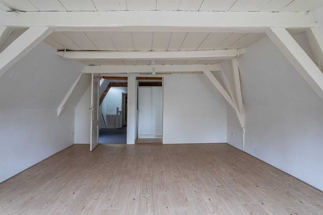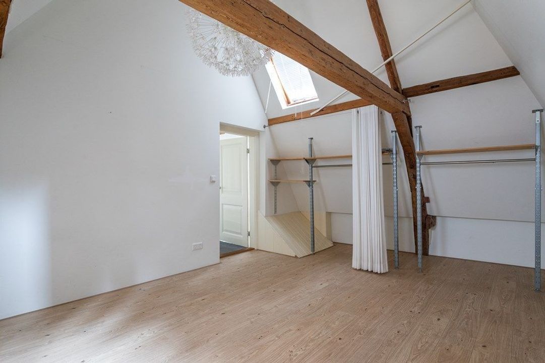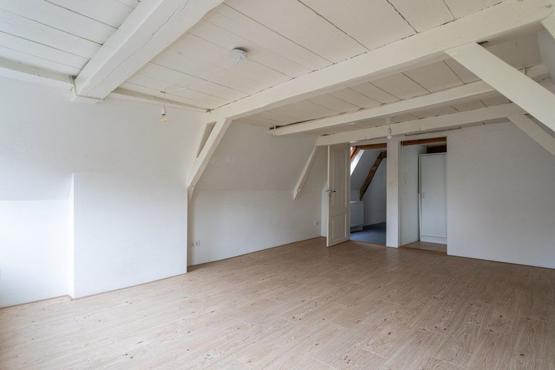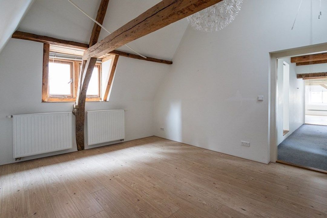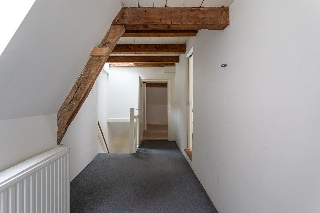 On the first floor, you’ll find a spacious living and dining area at the front, filled with natural light and offering views of the historic surroundings. The original wooden beams and high ceilings add a wonderful sense of character. At the rear is the large kitchen, equipped with various built-in appliances. French doors open onto the roof terrace of approximately 19.6 m² — a lovely spot to enjoy the afternoon and evening sun. From the hallway, you also have access to the toilet and the staircase to the second floor.
