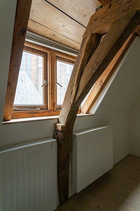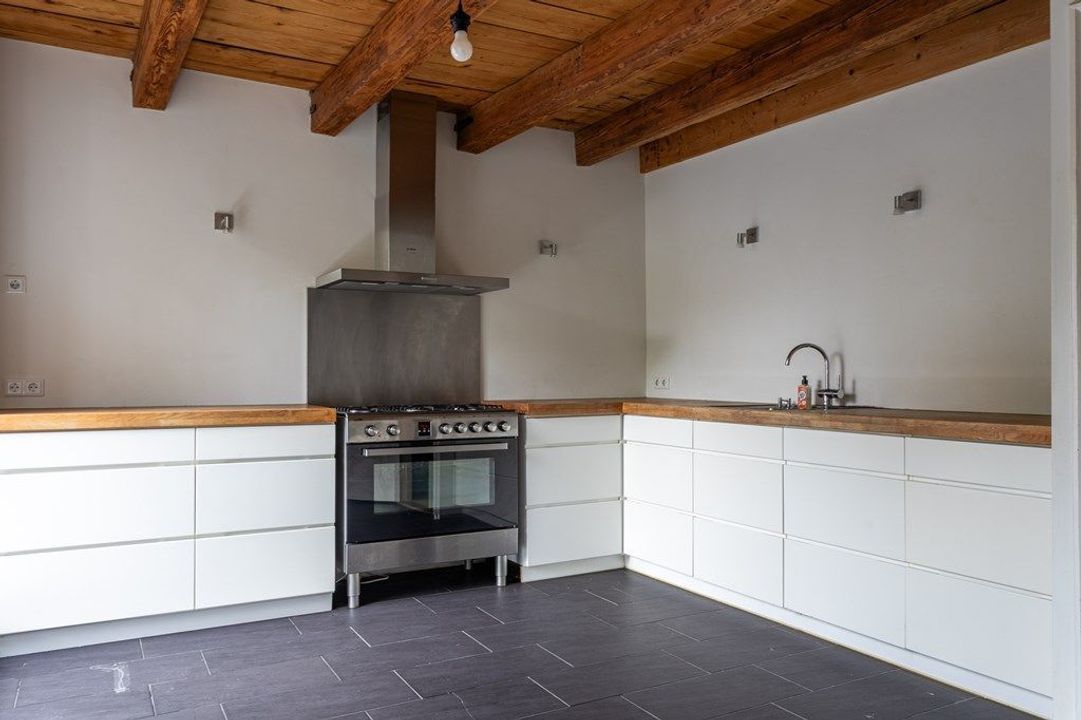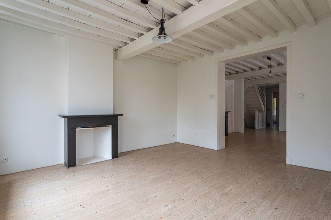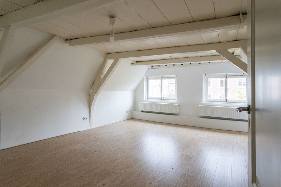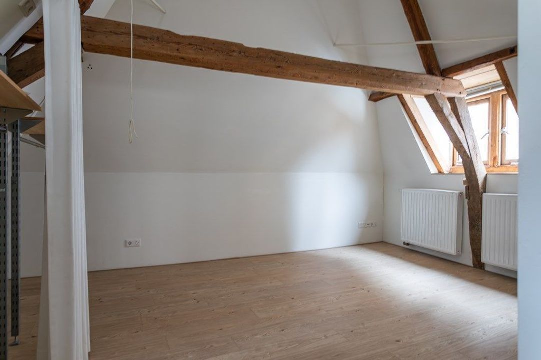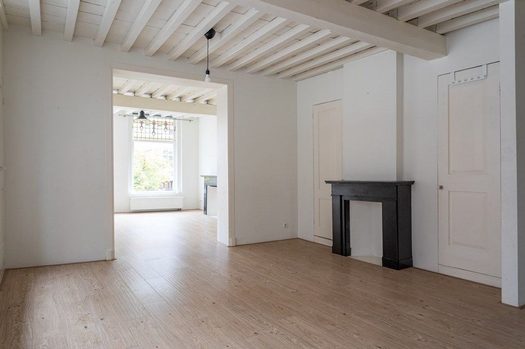On the first floor, you’ll find a spacious living and dining area at the front, filled with natural light and offering views of the historic surroundings. The original wooden beams and high ceilings add a wonderful sense of character. At the rear is the large kitchen, equipped with various built-in appliances. French doors open onto the roof terrace of approximately 19.6 m² — a lovely spot to enjoy the afternoon and evening sun. From the hallway, you also have access to the toilet and the staircase to the second floor.