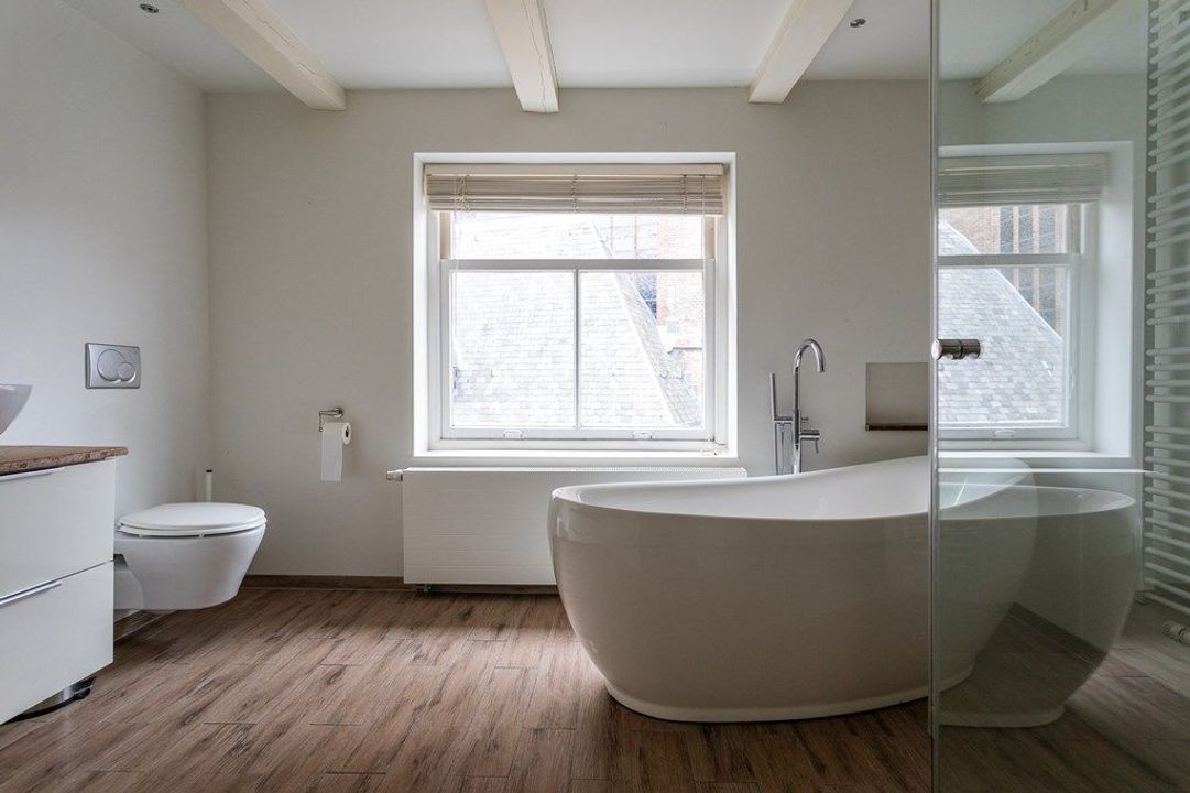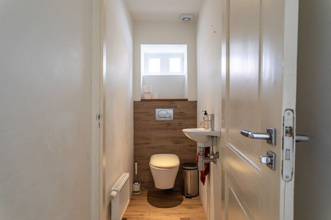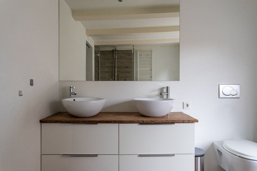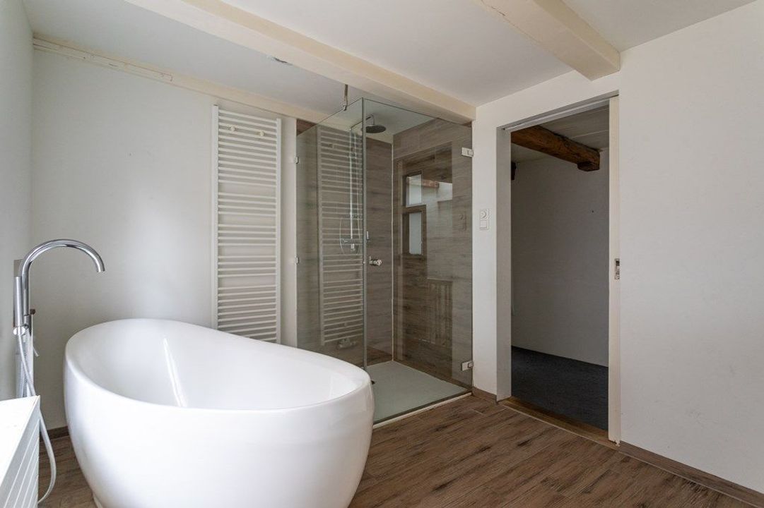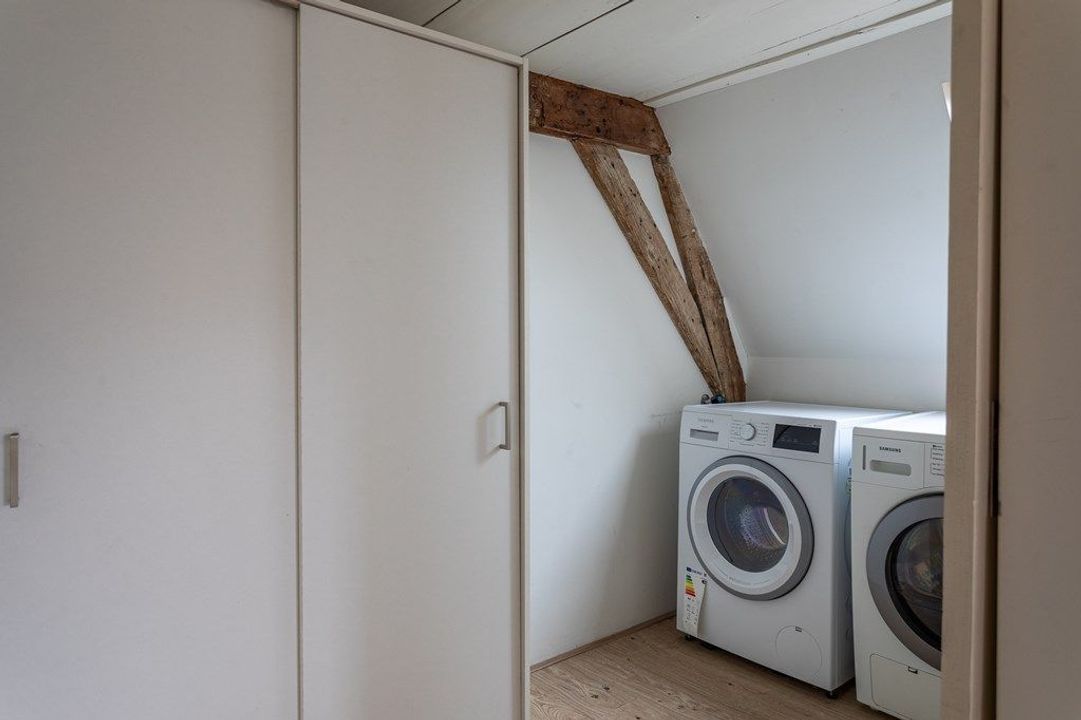 Op deze verdieping bevinden zich twee ruime slaapkamers, elk met een eigen sfeer door de zichtbare kapconstructie en dakramen. In het midden ligt de moderne badkamer met ligbad, dubbele wastafel, inloopdouche en tweede toilet. Aangrenzend is er een praktische berging met aansluiting voor wasmachine en droger.