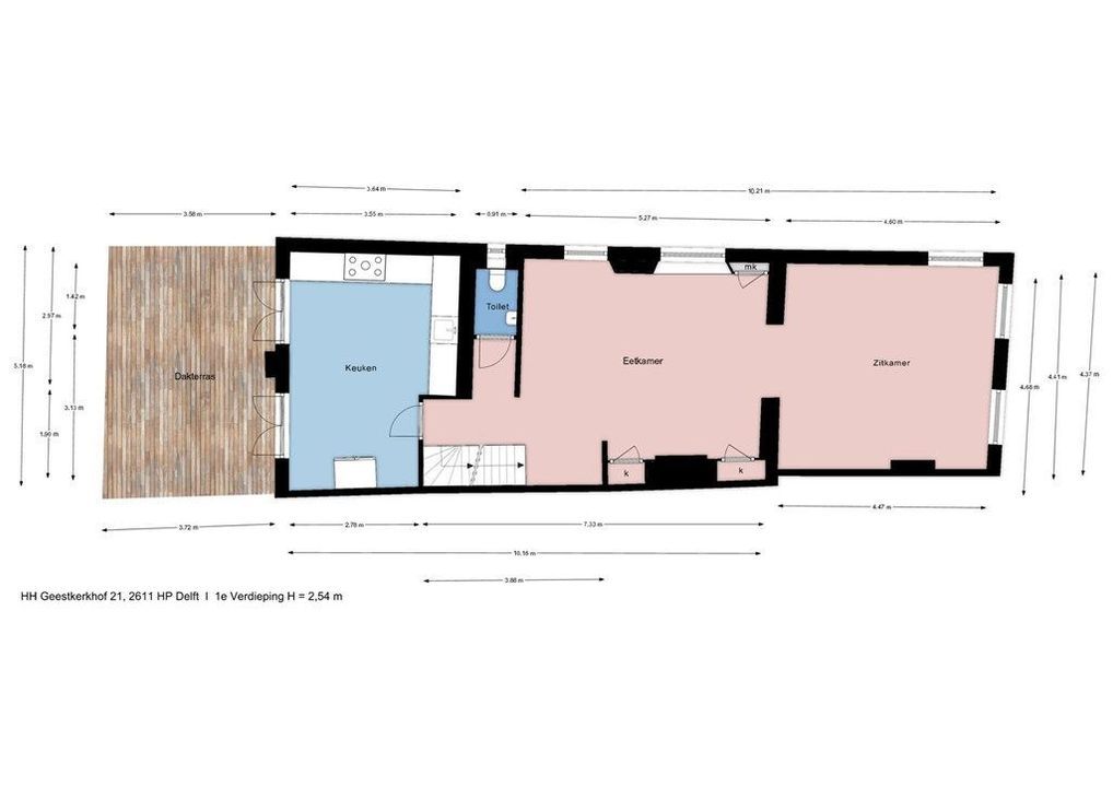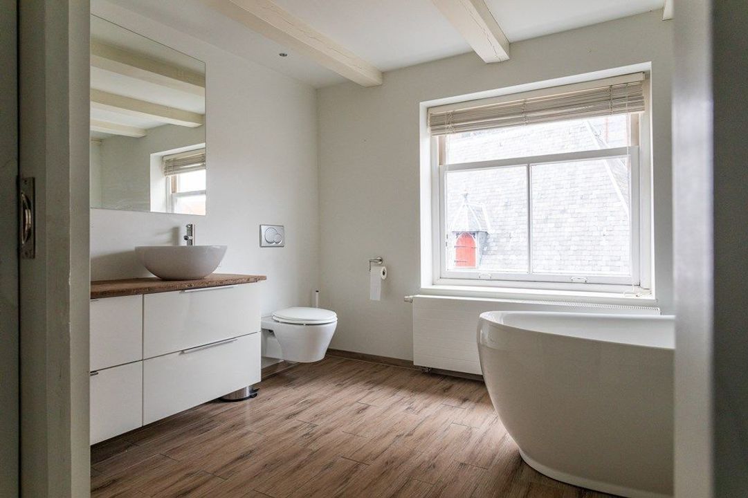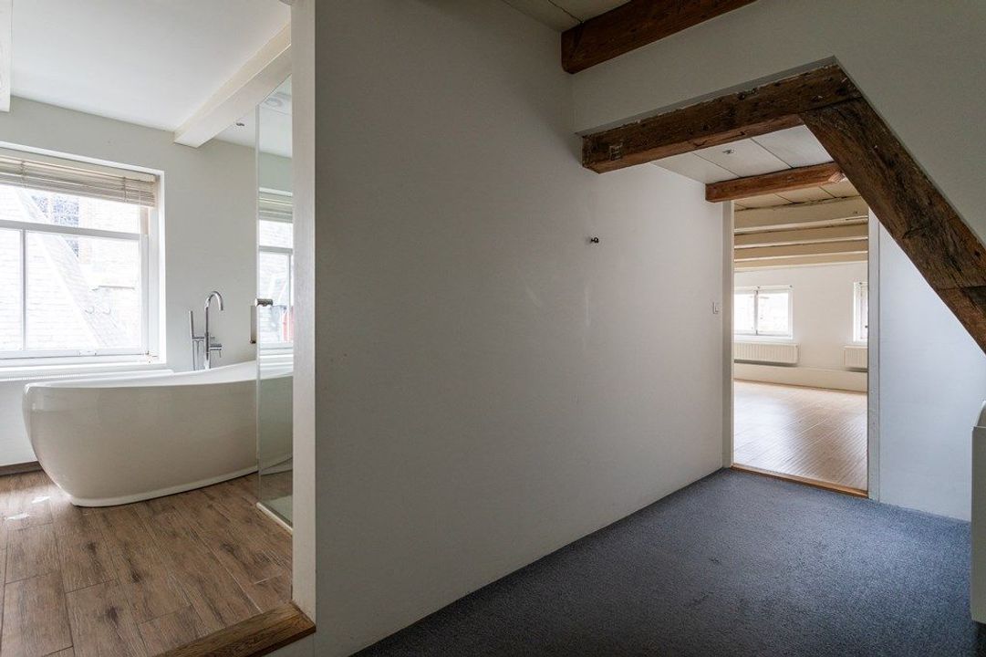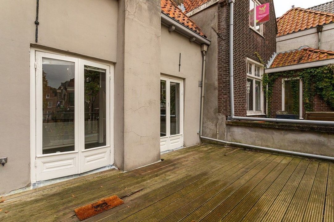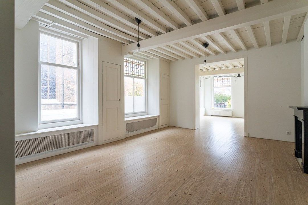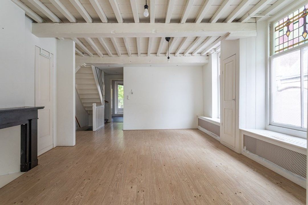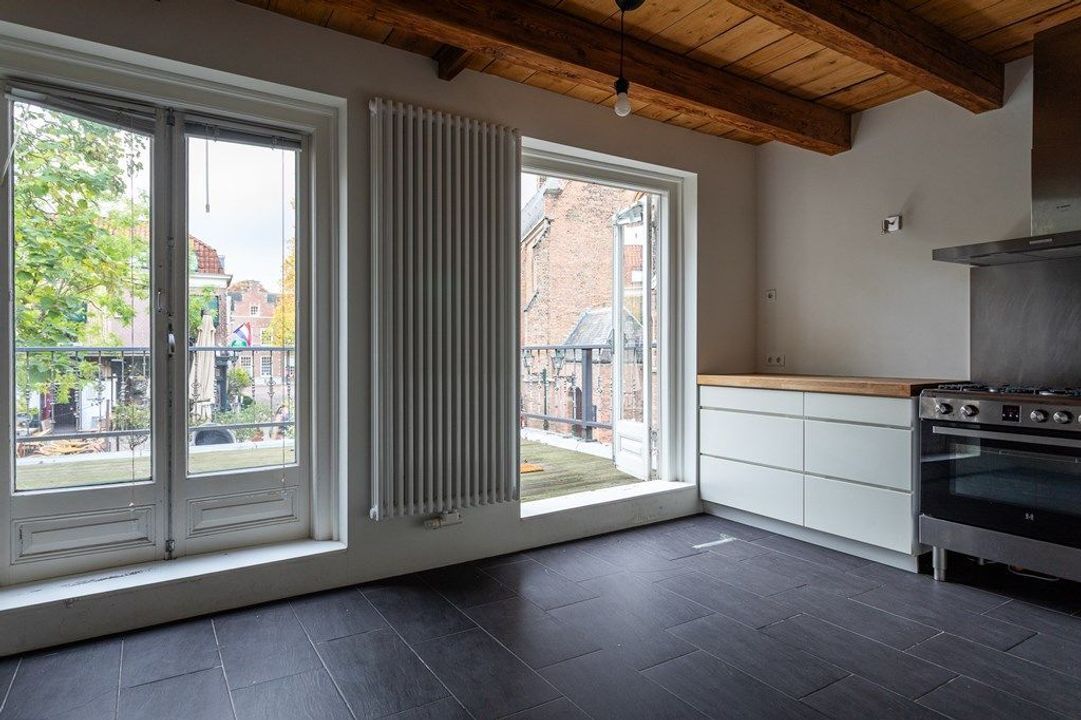 Op de eerste verdieping vind je de ruime woon- en eetkamer aan de voorzijde met veel lichtinval en zicht op de historische omgeving. De originele balken en hoge plafonds geven de ruimte karakter. Aan de achterzijde bevindt zich de royale keuken, voorzien van diverse inbouwapparatuur. Vanuit de keuken geven openslaande deuren toegang tot het dakterras van circa 19,6 m², een heerlijke plek om van de middag- en avondzon te genieten. Via de hal zijn tevens het toilet en de trap naar de tweede verdieping bereikbaar.