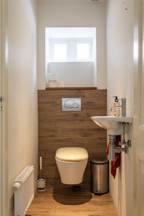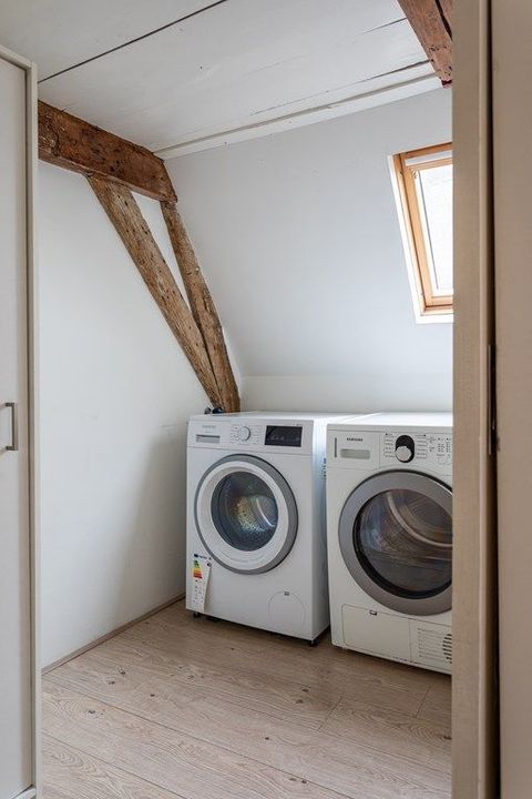 The second floor features two generous bedrooms, each with its own charm thanks to the exposed roof structure and skylights. In the center is the modern bathroom with a bathtub, double washbasin, walk-in shower, and second toilet. Adjacent to the bathroom is a practical utility room with connections for a washing machine and dryer.