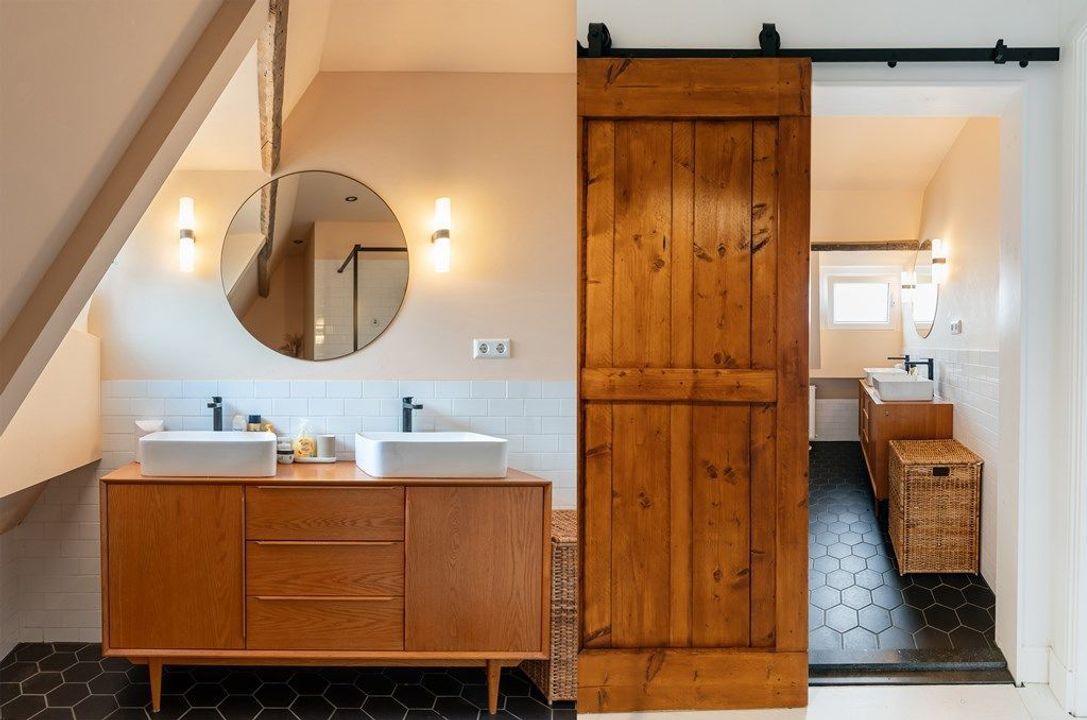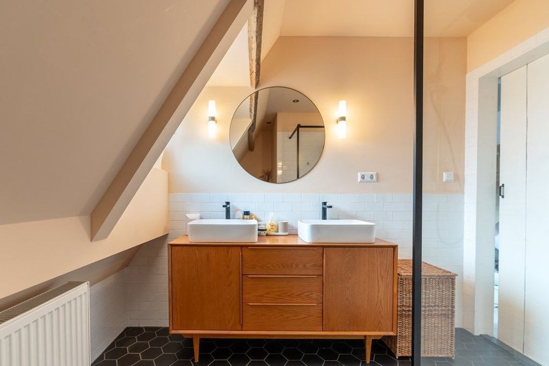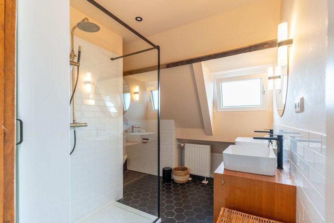 The second floor accommodates three bedrooms and the bathroom. This level is defined by its stunning wooden beams, carefully restored during renovation. At that time, the entire floor was updated: the roof and attic were insulated, and both the bathroom and toilet were completely renewed. With ceilings reaching up to 3.72 metres, the rooms feel particularly spacious and full of character. Every detail was executed with quality craftsmanship, resulting in a perfect blend of modern comfort and authentic charm.