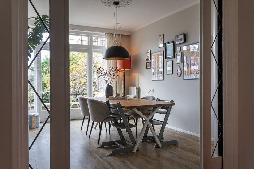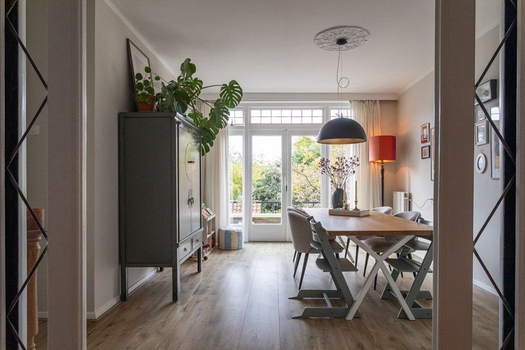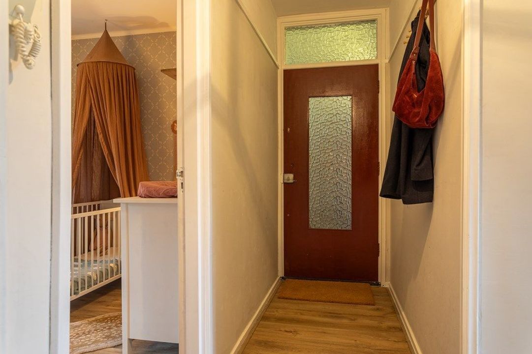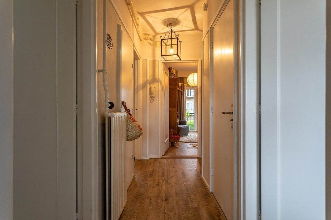 Gesloten portiek met brievenbussen- en bellentableau, entree appartement op de eerste verdieping. Na binnenkomst L-vormige hal met toilet, die toegang biedt tot alle vertrekken. Ruime en lichte woonkamer en suite, voorzien van de klassieke schuifseparatie met glas in lood en vier vaste kasten. Aan de voorzijde vind je het gezellige zitgedeelte met houtkachel en recent geplaatste inbouwkast. Aan de achterzijde bevindt zich het eetgedeelte met openslaande deuren naar het zonnige balkon. Het balkon is gelegen op het zuidwesten, heeft heerlijk vrij uitzicht, heeft over de volledige breedte een diepte van 1,40m en beschikt over een balkonkast.