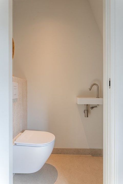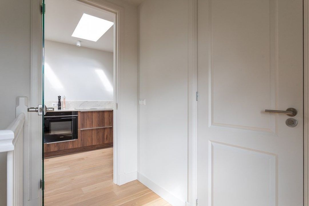 The living area is situated on the third floor, offering plenty of natural light and a spacious feel. The kitchen is centrally positioned and connects to the dining room, from where French doors open onto the sunny roof terrace. At the front you will find the generous living room, a pleasant space to relax. Another separate toilet is available on this floor.