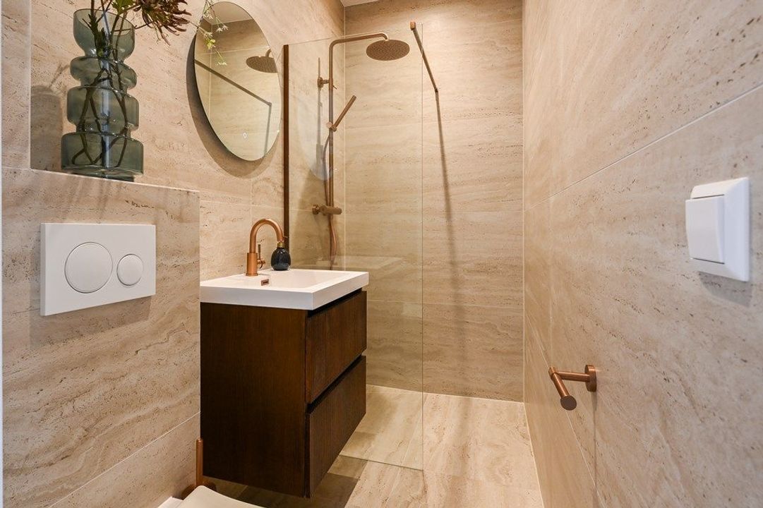 De moderne, stijlvolle badkamer is voorzien van een ruime inloop(regen)douche met handdouche, wastafelmeubel en toilet.