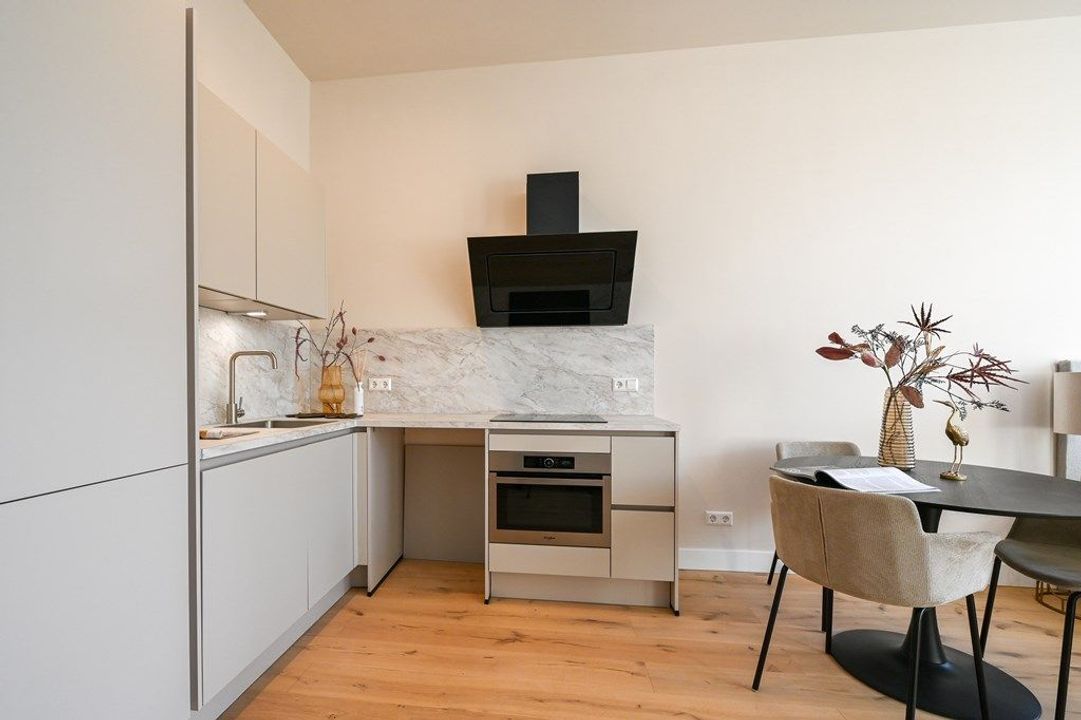 Through the intercom panel and shared entrance on the ground floor with meter cupboard, you access the studio. Entry into the living/sleeping area with an open, luxuriously finished L-shaped kitchen equipped with: