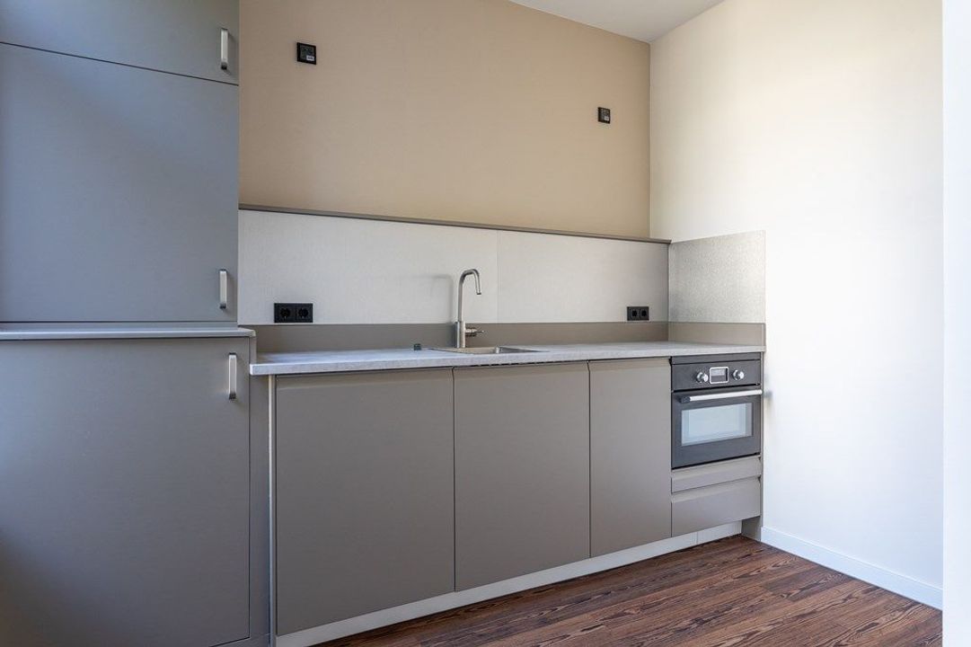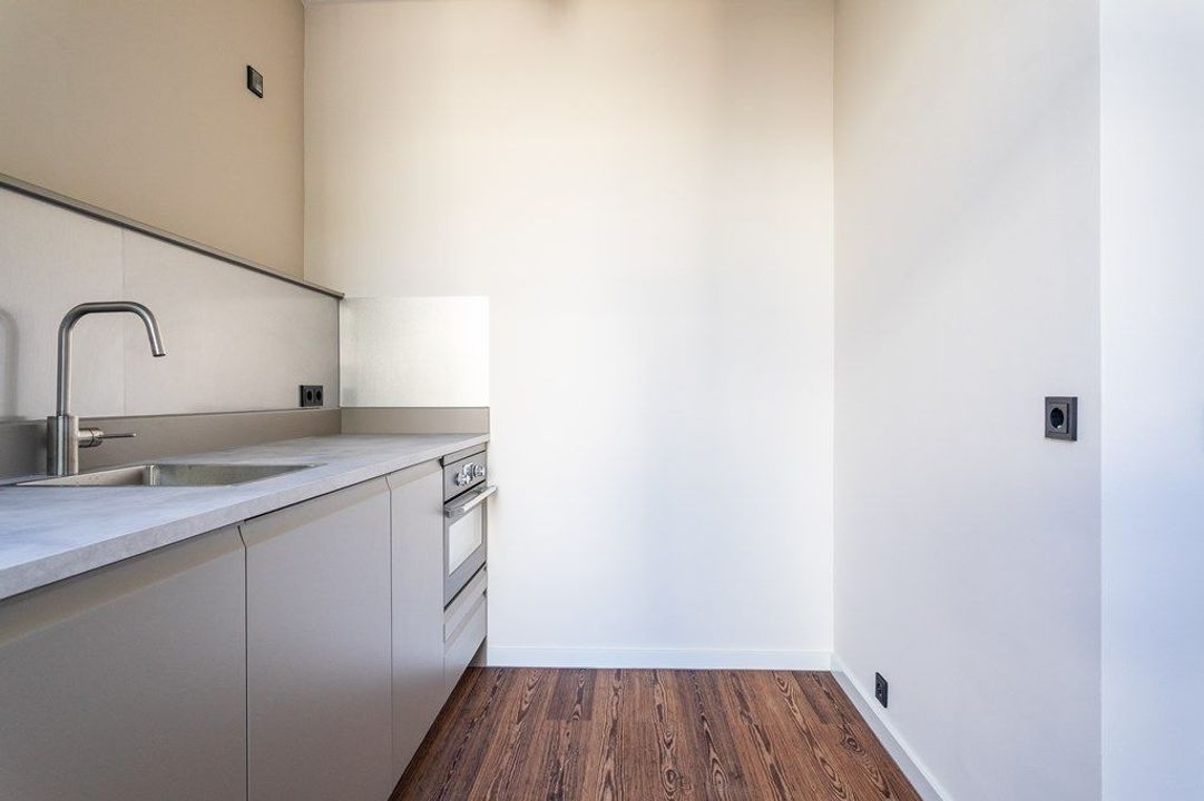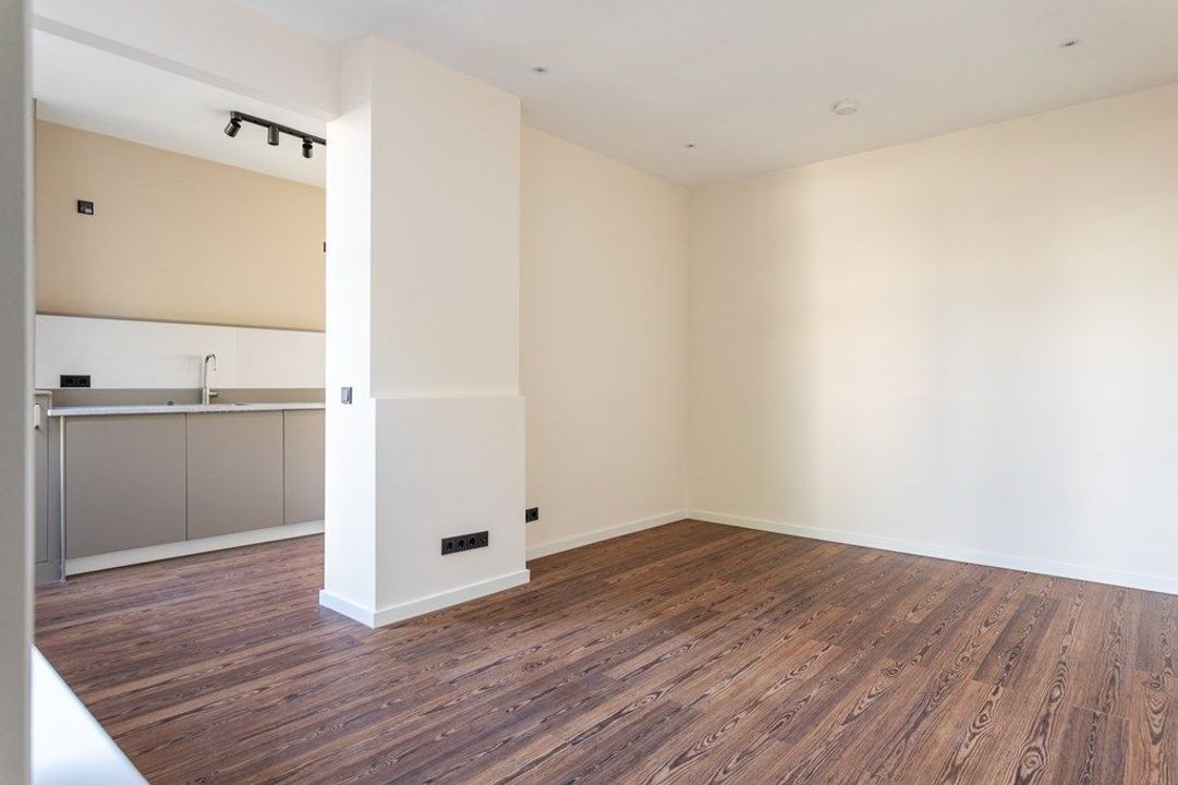 The apartment has been recently renovated and is efficiently laid out. The living room features a ceiling height of approximately 2.85 metres, creating a spacious feel. The open-plan kitchen connects directly to the living area.