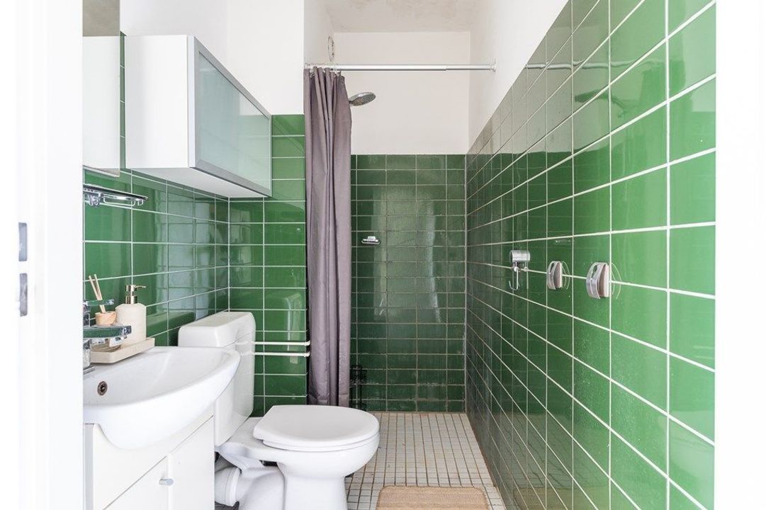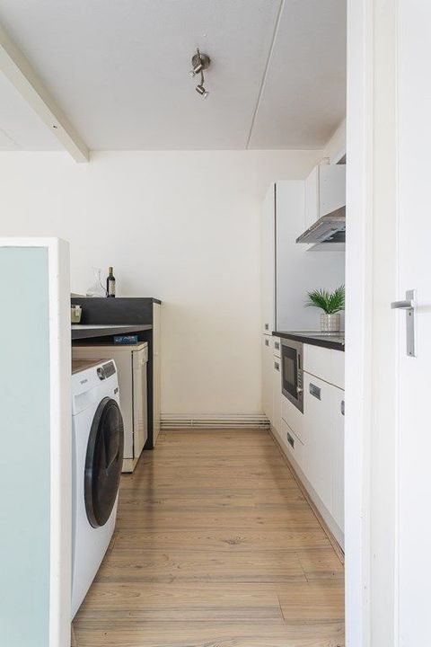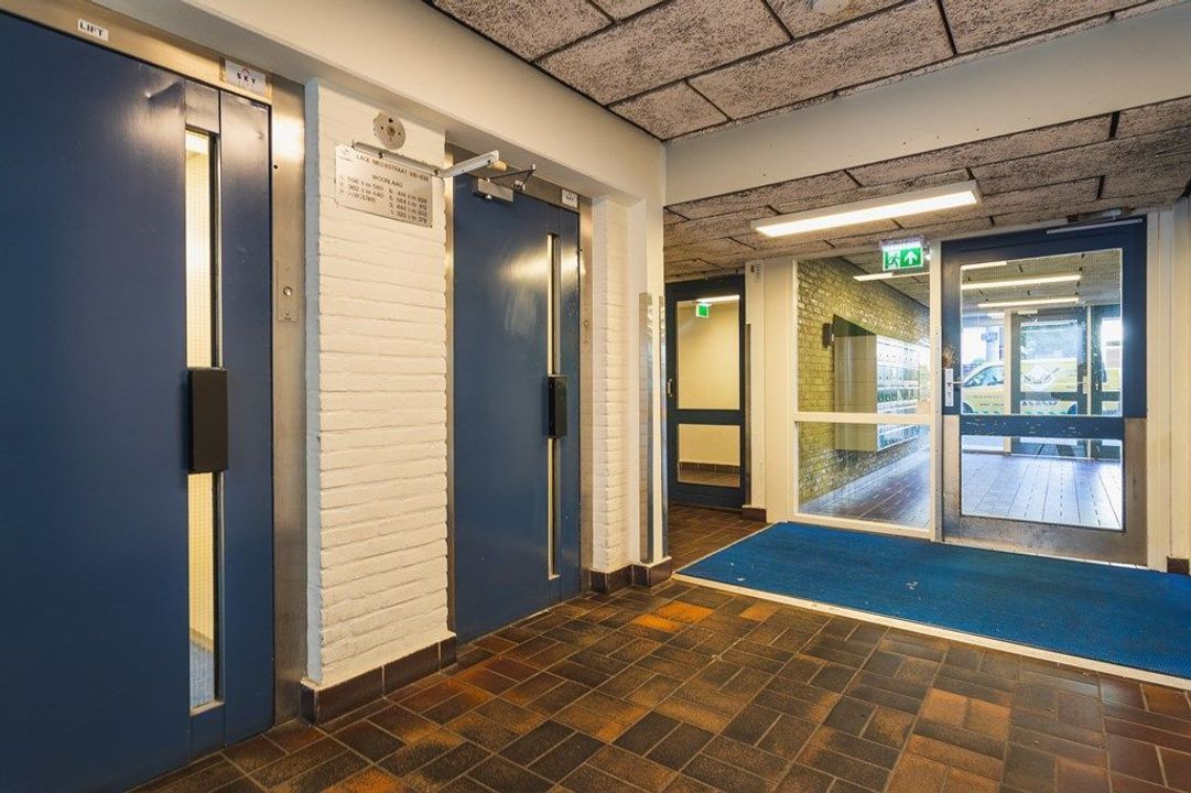 Central entrance with mailboxes and doorbell panel, secured central hall with lift and stairwell. Entrance to the apartment on the 5th floor: hallway with meter cupboard, bathroom with shower, toilet and washbasin, and an internal storage room. From the hallway access to the living room with adjoining balcony, and a modern semi-open kitchen separated from the living area by a breakfast bar. The kitchen is equipped with various built-in appliances (large luxury fridge/freezer combination, induction hob and combi microwave) and a washing machine connection. From the living room there is access to the bedroom. Bicycle storage is located on the ground floor.