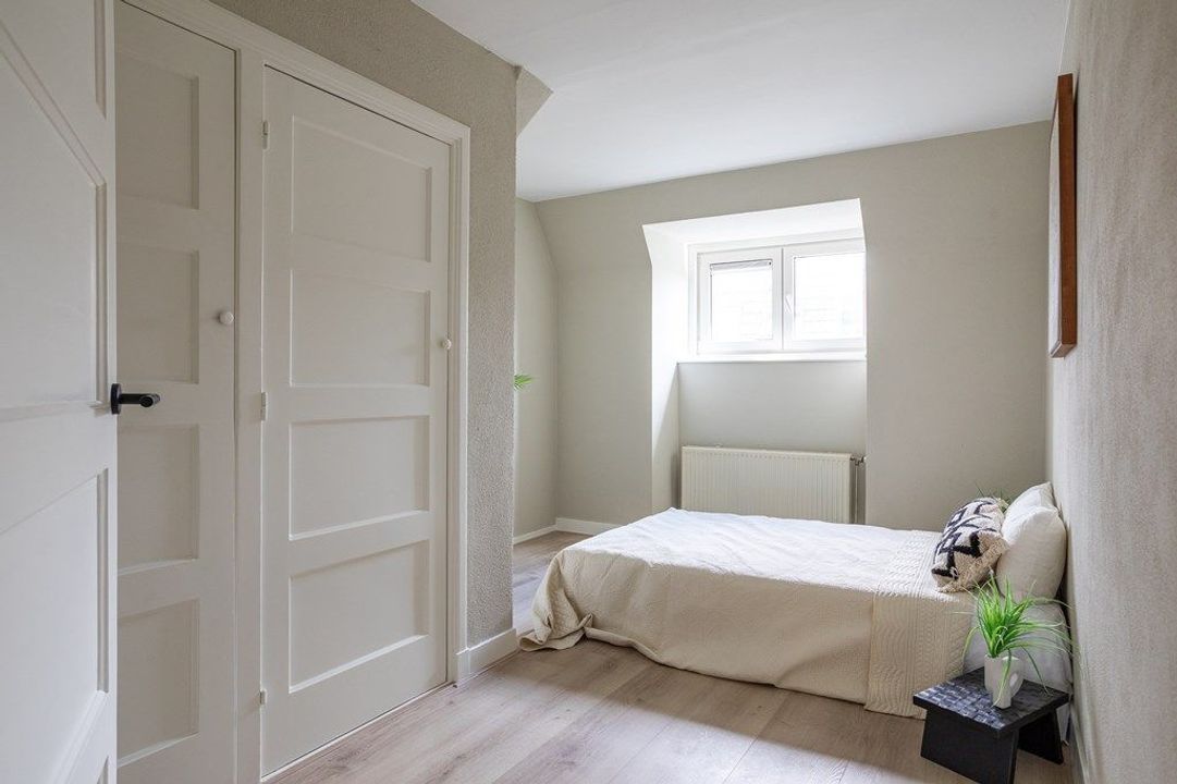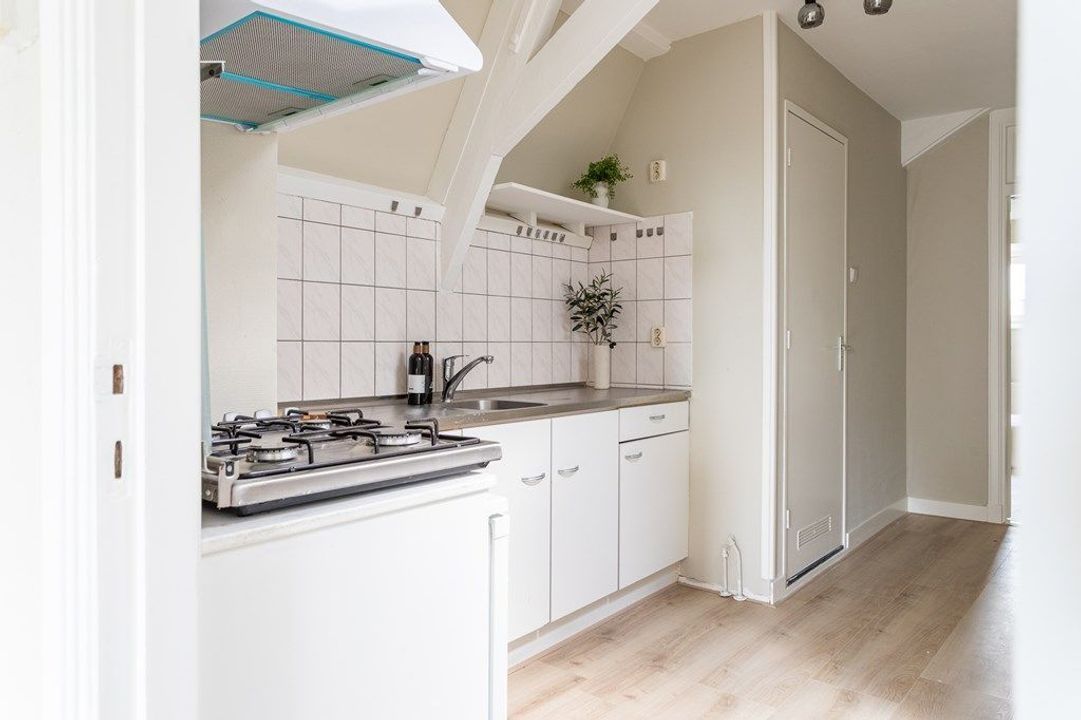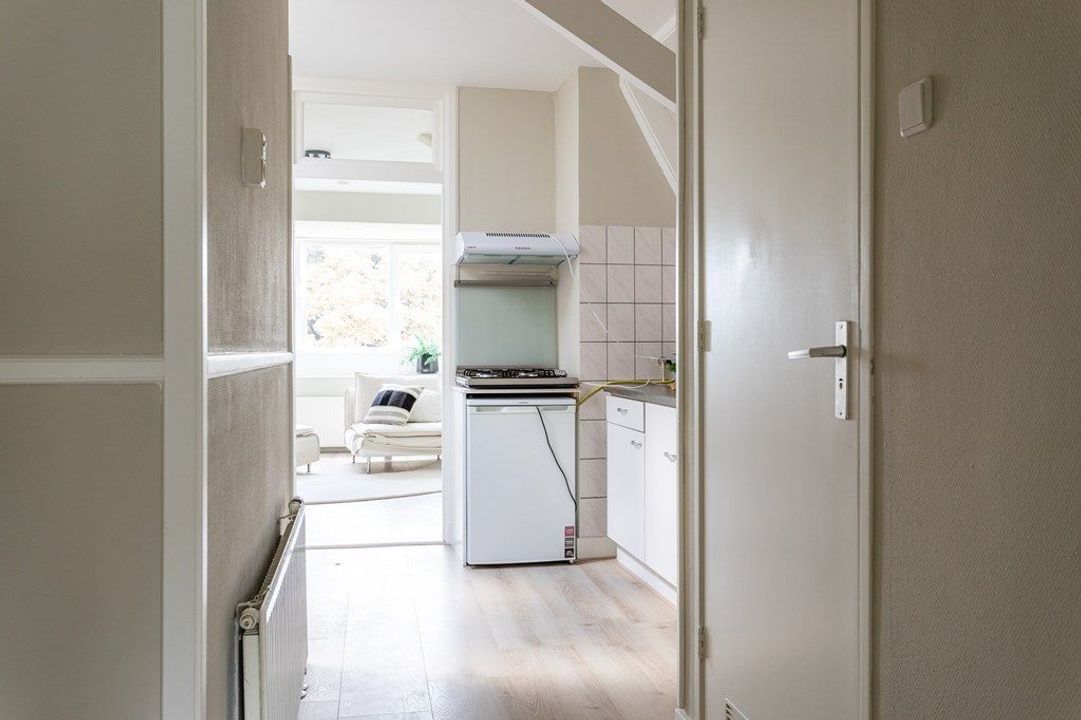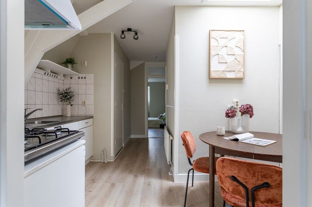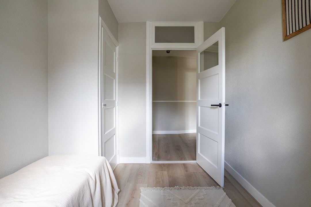 Gezamenlijke entree vanaf straatniveau. Op de derde verdieping: entree met hal en vaste kasten. Aan de voorzijde de lichte woonkamer en vrij uitzicht. Centraal in de woning een separate keuken. Aan de achterzijde twee slaapkamers: een ruime hoofdslaapkamer (ca. 12 m²) en een tweede kamer (ca. 7 m²), ideaal als werk- of logeerkamer. Badkamer met douche, wastafel en toilet. Meerdere vaste kasten zorgen voor handige bergruimte.