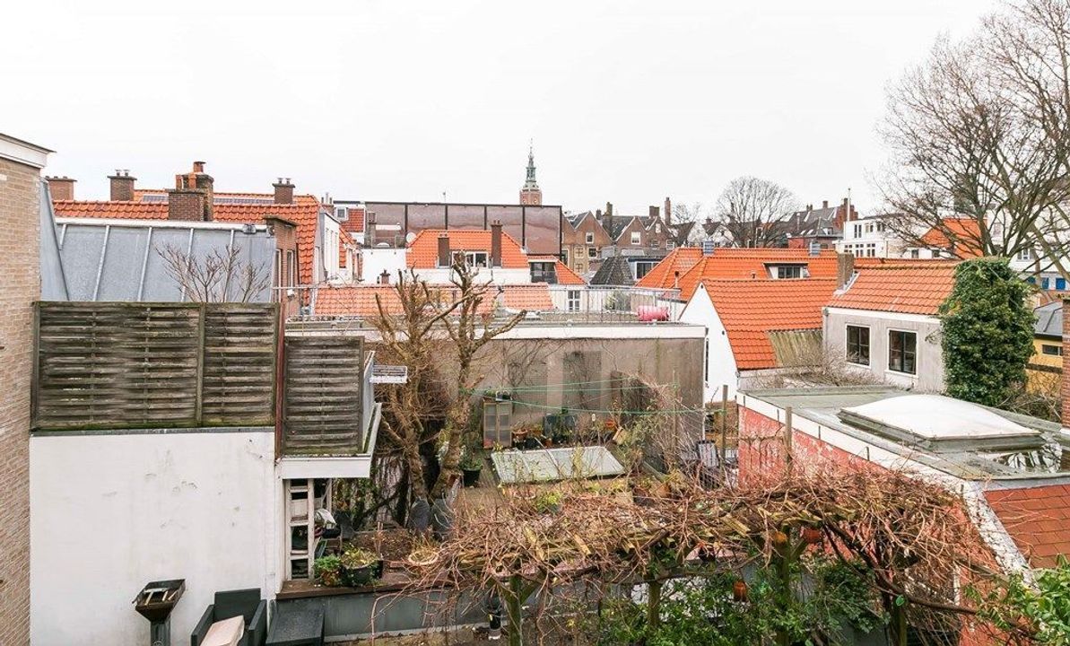 At the front it overlooks the Lange Beestenmarkt and the idyllic Hofje van Wouw. At the rear, the terrace and rooms offer stunning views over the rooftops, inner gardens and the monumental Haagsche Toren of the Grote Kerk.