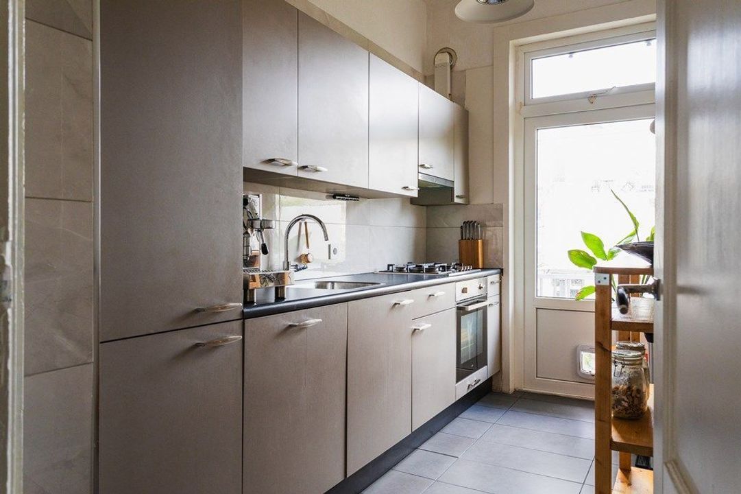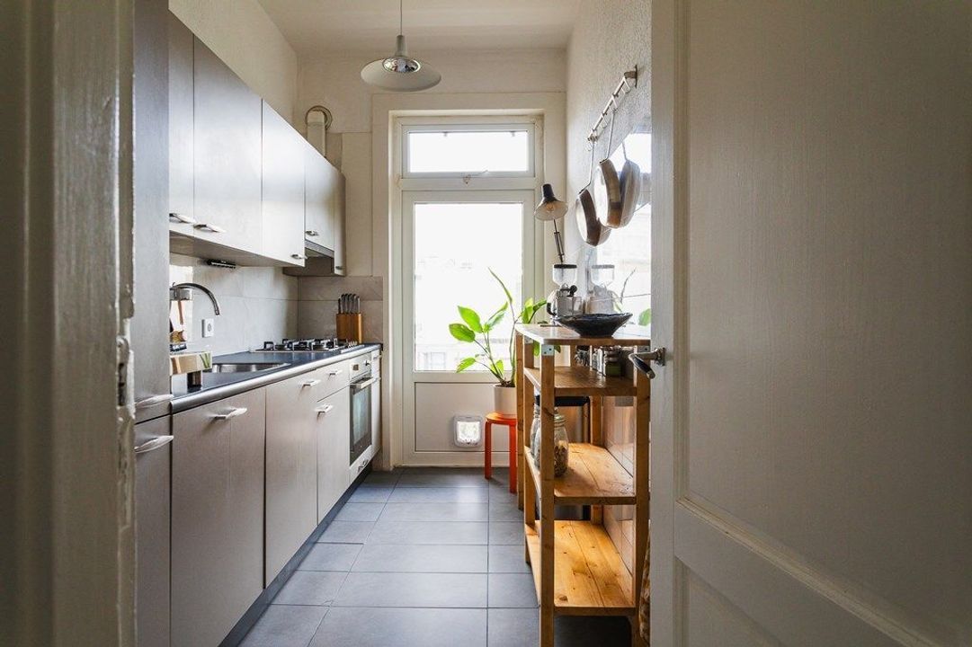 De keuken ligt eveneens aan de achterzijde en biedt toegang tot het verbrede balkon (ca. 1.20 m diep) met nieuwe vlonders. Hier is het zonnig vanaf de middag tot in de avond.