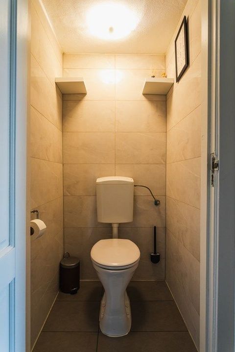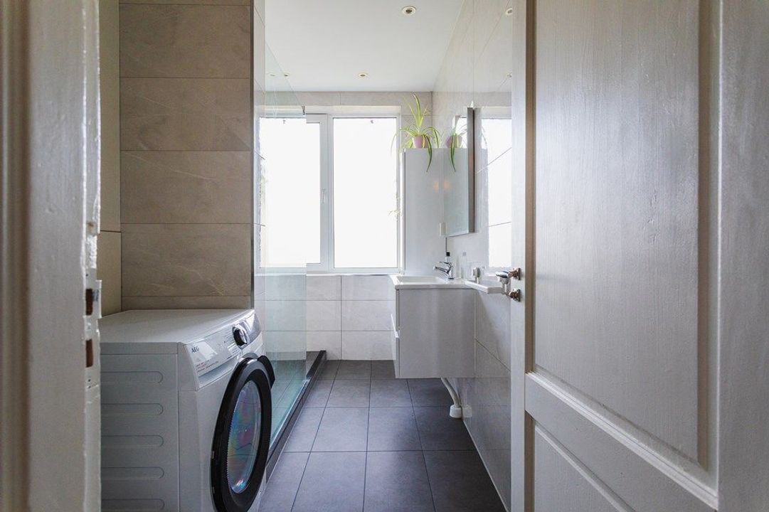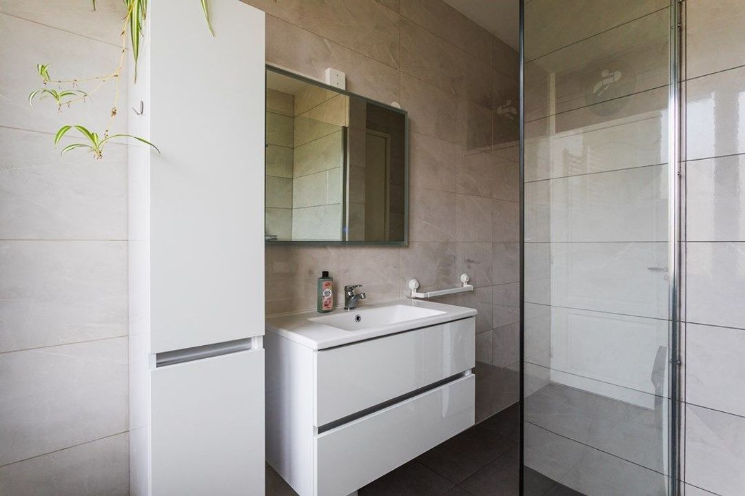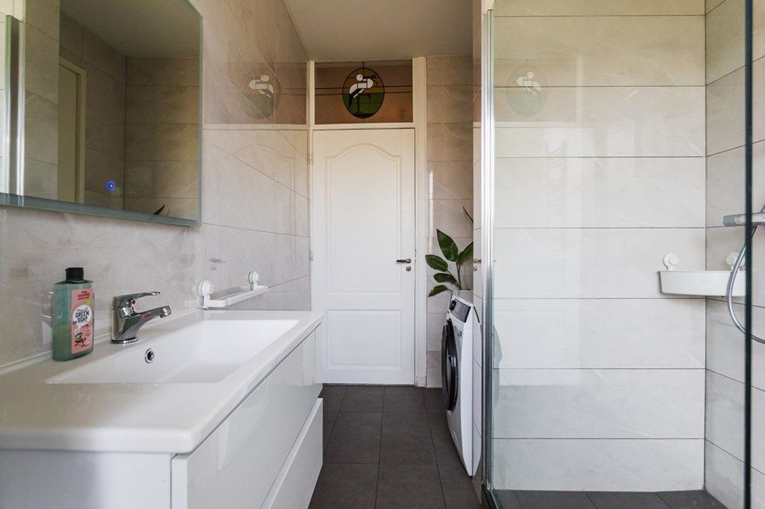 De badkamer is voorzien van een inloopdouche, wastafelmeubel, spiegel en wasmachineaansluiting. Het toilet is separaat en netjes uitgevoerd.