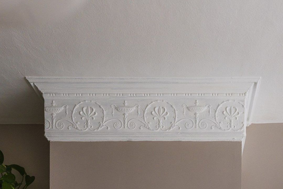 Entrance through the shared portico to the first floor. Hallway with built-in cupboard and additional storage space integrated into the ceiling.