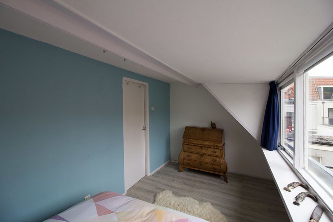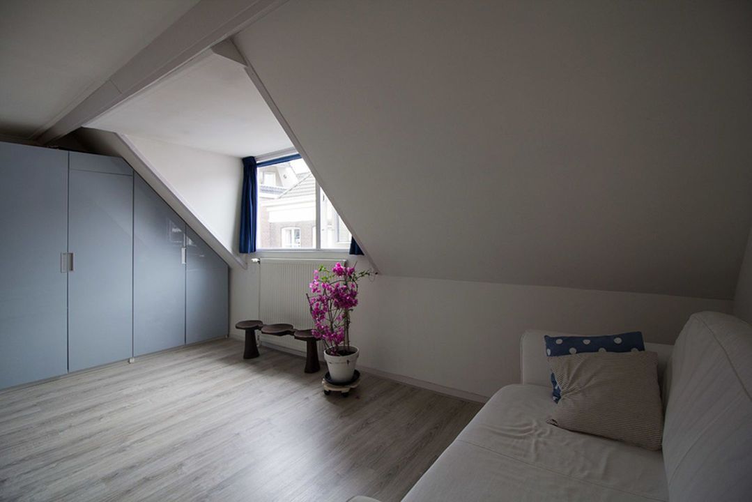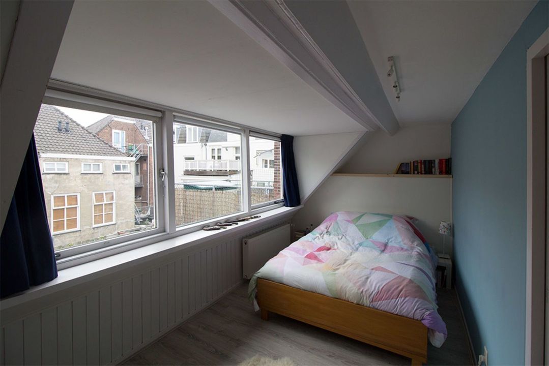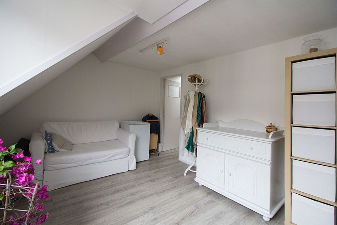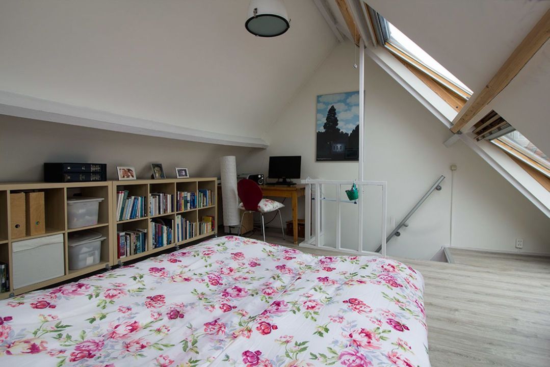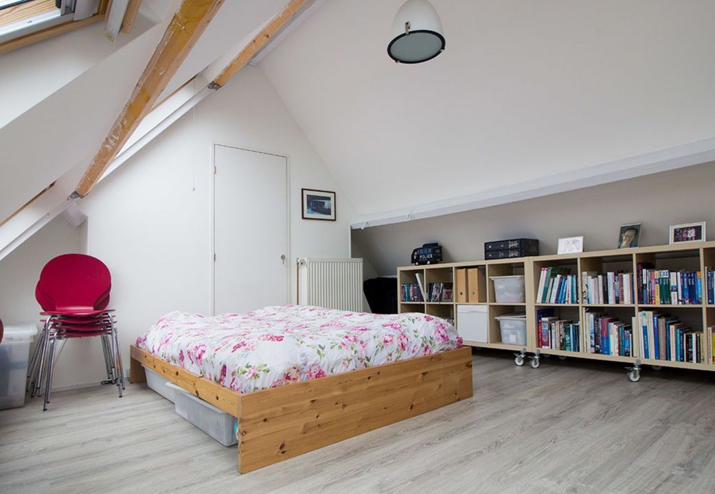 Trap naar 3e etage (zolder). Grote lichte slaapkamer (20m2) die voorzien is van velux-dakramen en berguimte. De meubilering op de foto's is eigendom huidige bewoners. Bij aanvang huur wordt gezorgd voor de zelfde stijl meubilering