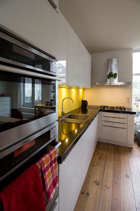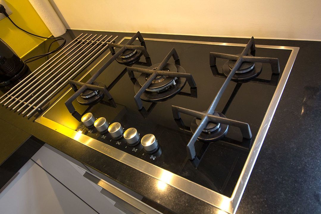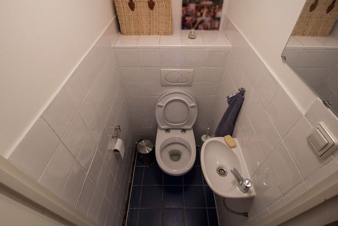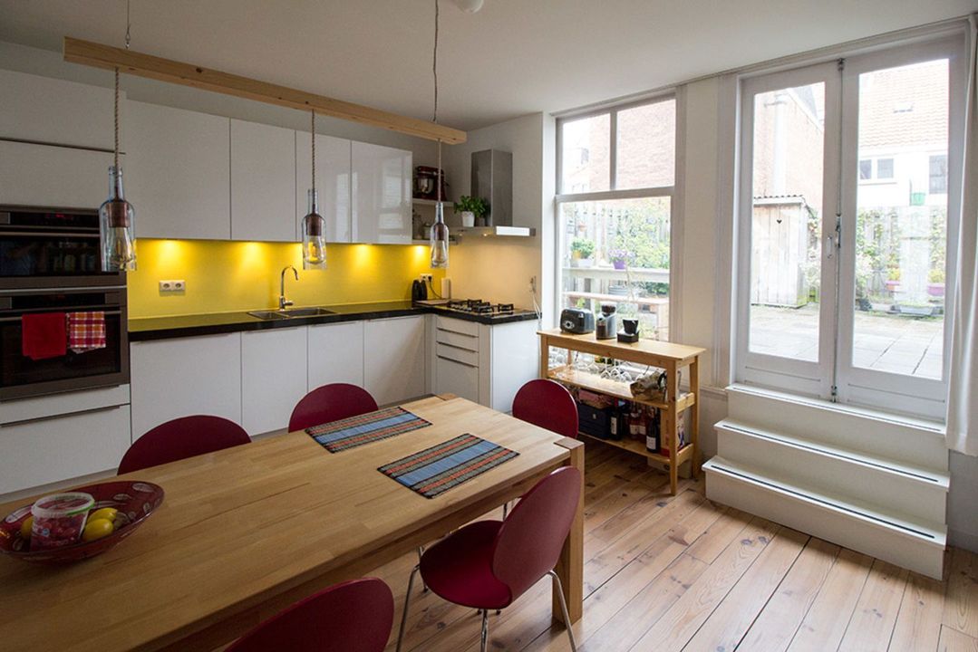 Entree met fraaie tegelwand en ophangsysteem voor fiets. Toilet. Trap naar eerste etage die uitkomt midden in de etage. Lichte woonkamer met houten vloer (18m2). Grote open woonkeuken (18m2) met granieten werkblad en diverse inbouwapparatuur zoals een 5 pits gasstel, oven, magnetron, koelkast met vriezer en afwasmachine. Middels openslaande deuren toegang tot een groot terras (5.4m x 6.3m) gelegen op het zuid-westen.