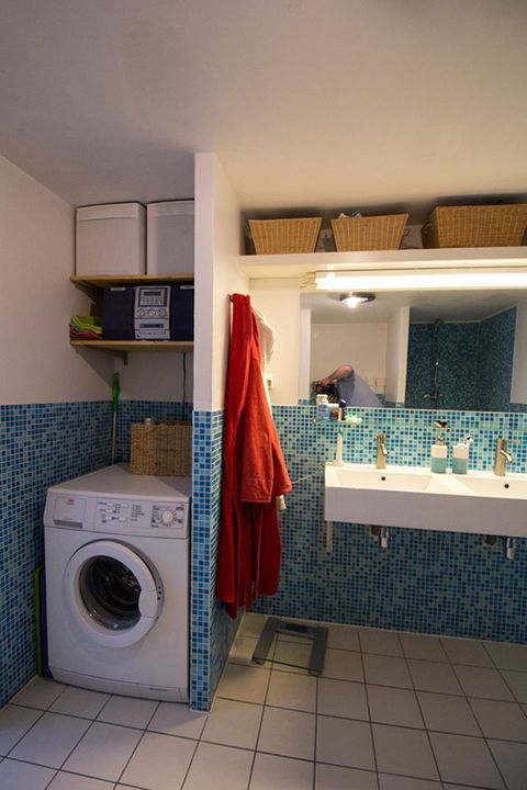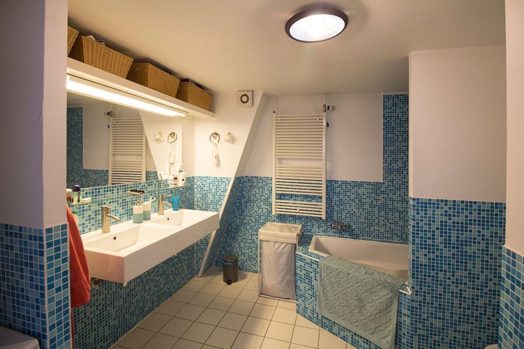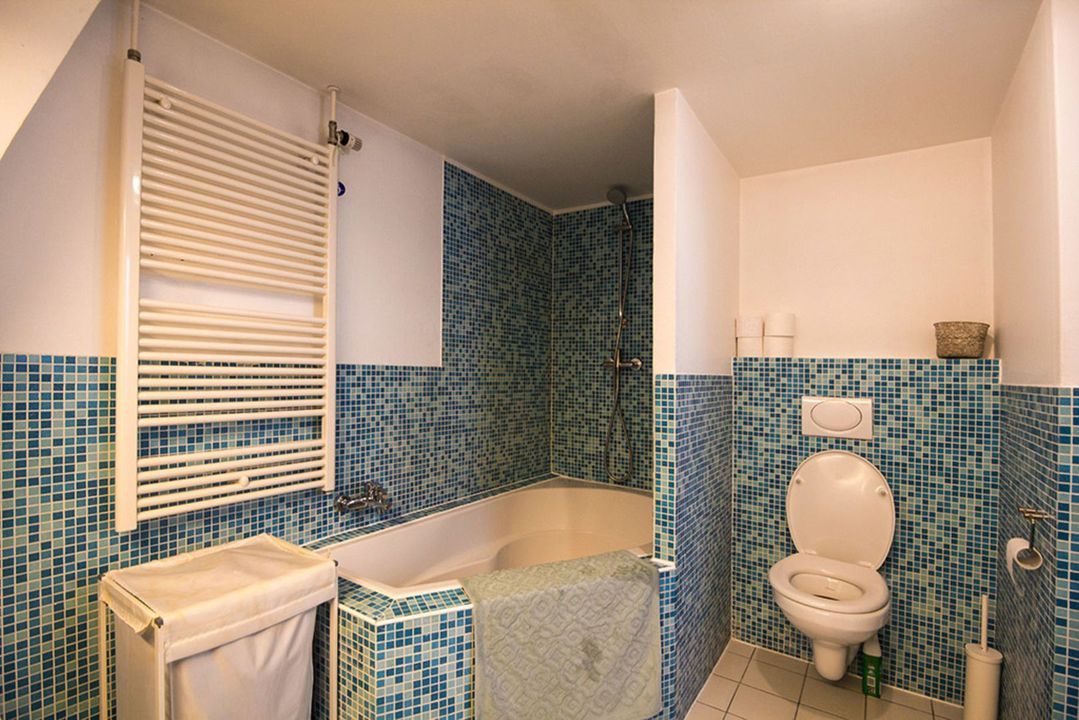 Trap naar de 2e etage. Op deze etage bevinden zich twee ruime slaapkamers van ongeveer dezelfde grootte (11m2 en 15 m2). Fraai betegelde badkamer (6m2) met groot bad met douche, toilet en dubbele wastafel. In de badkamer bevindt zich ook een wasmachine.
