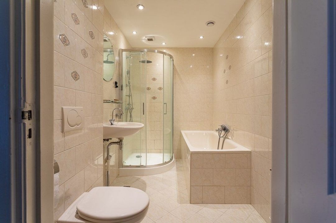 The apartment offers a spacious living room with a balcony. There are two generous bedrooms, one at the front and one at the back. The kitchen is equipped with all necessary built-in appliances, and the bathroom includes both a shower and a bathtub.