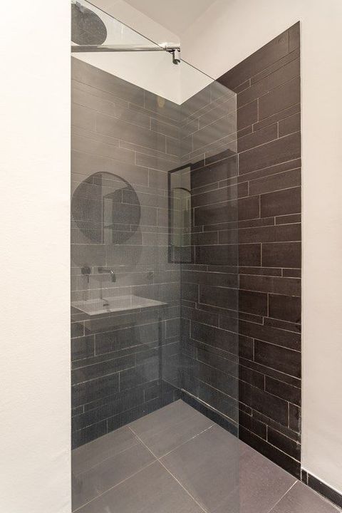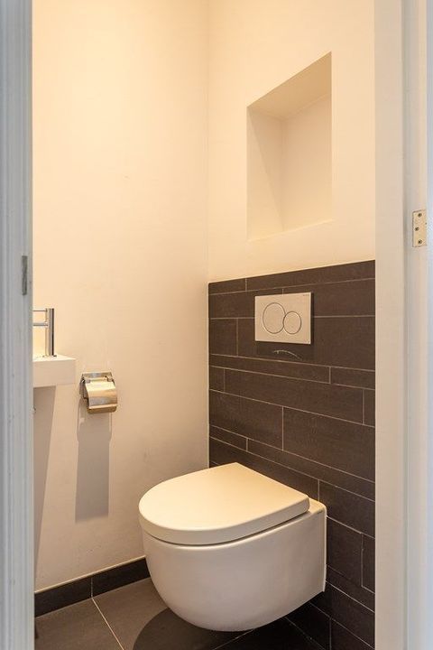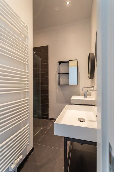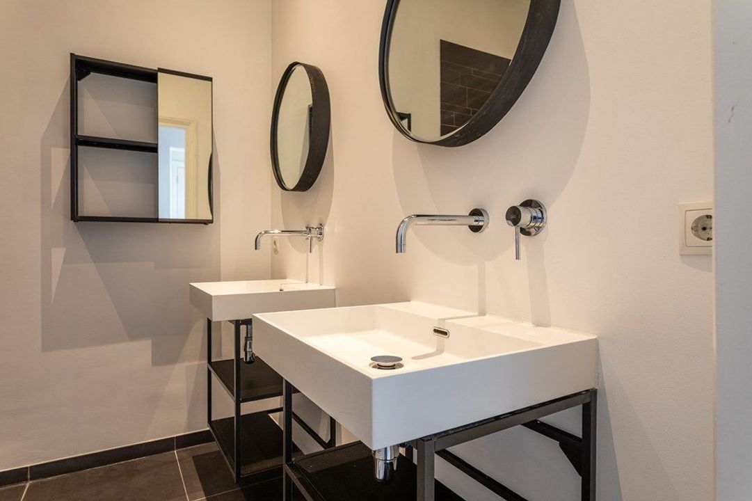 De moderne badkamer is stijlvol afgewerkt en voorzien van eigentijdse sanitaire voorzieningen.