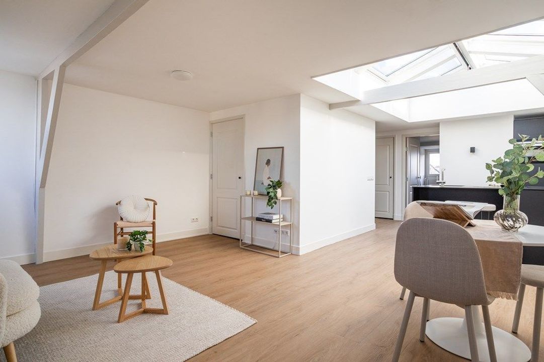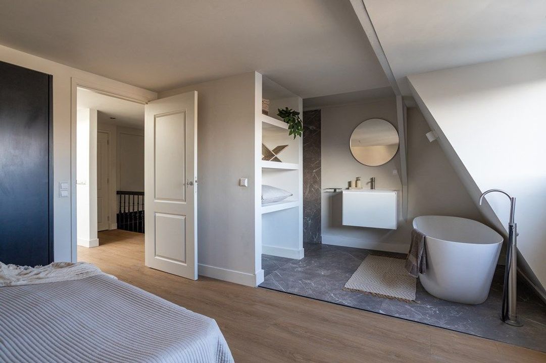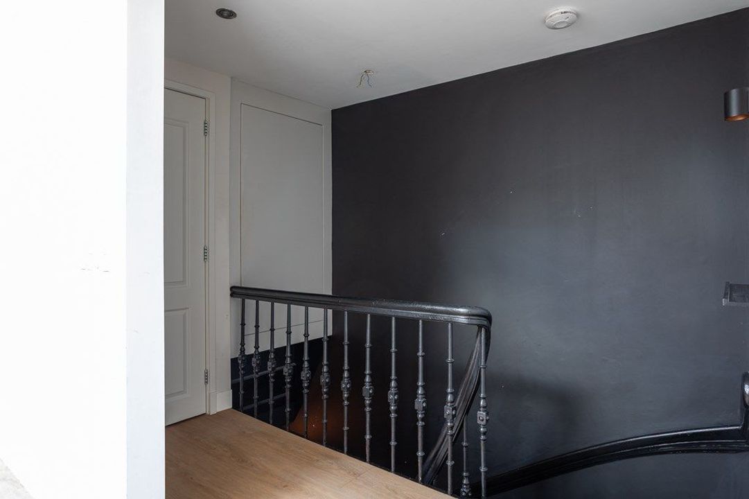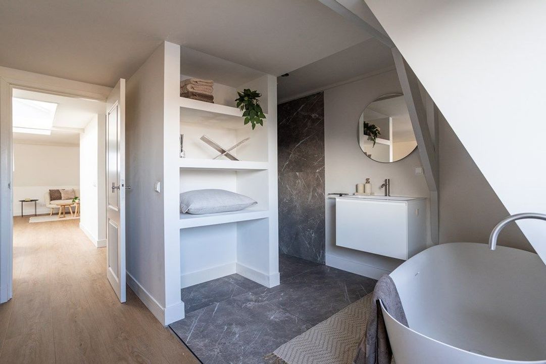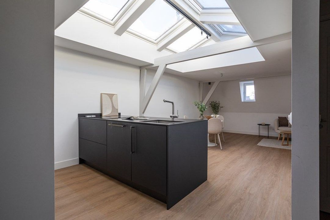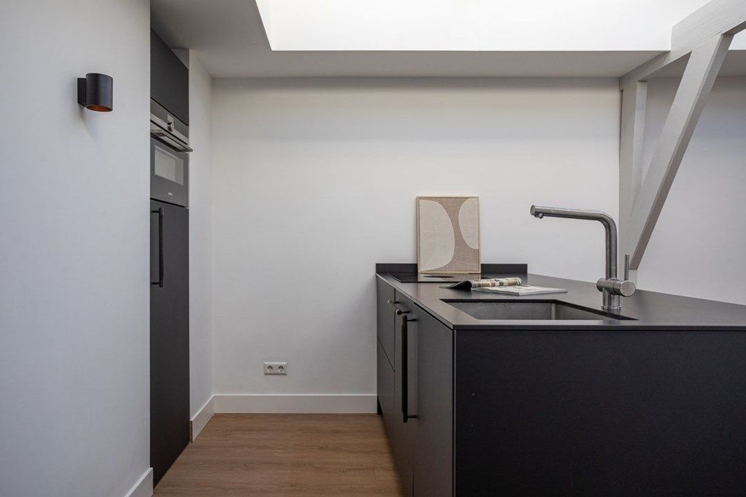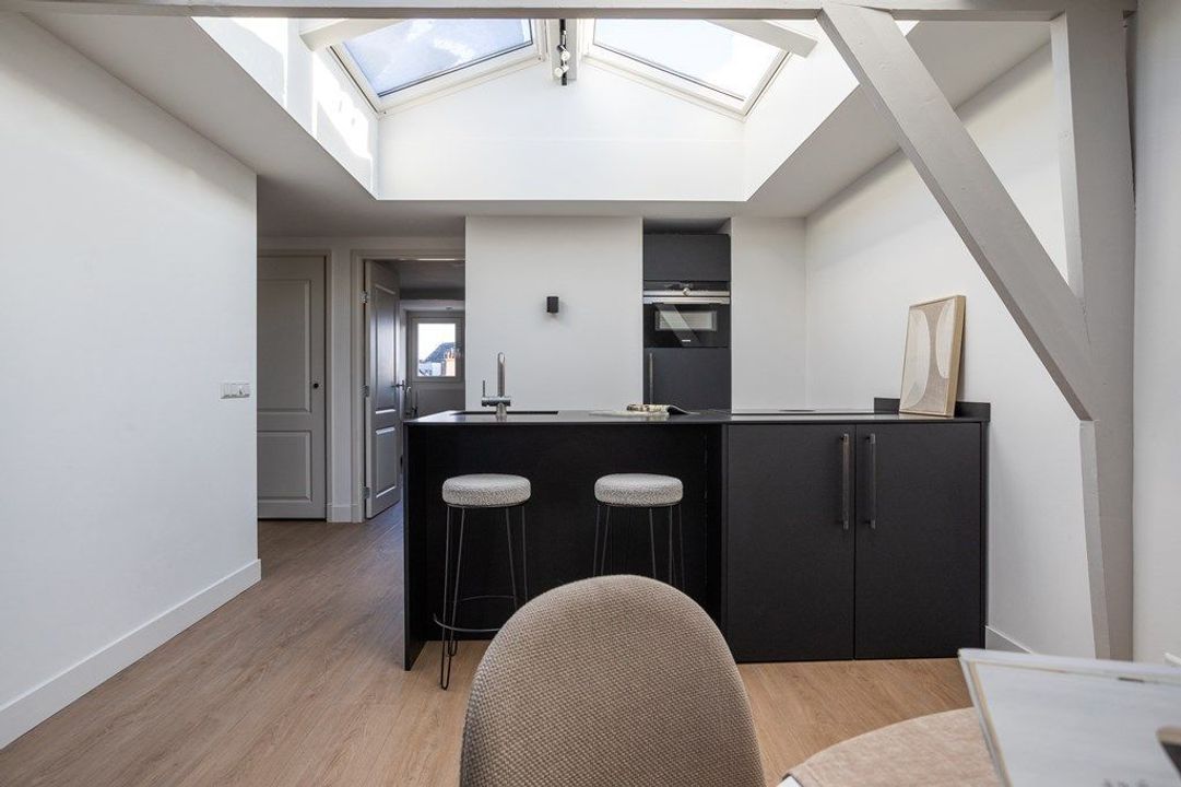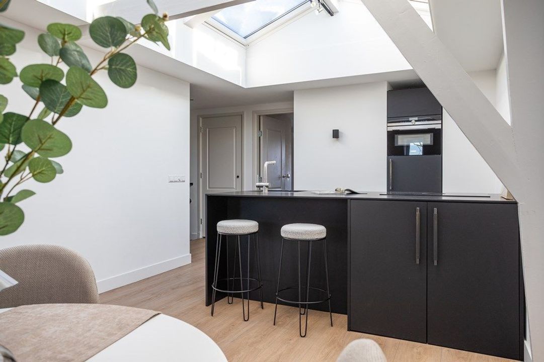 Central entrance at street level, hallway with meter cupboards, storage areas and stairwell. Stairs to the second floor, where the entrance to the apartment is located. Stairs to the third floor, leading to the spacious and bright living room, luxury open-plan kitchen with kitchen island, combination oven, dishwasher, and built-in fridge and freezer. At the rear is a generous bedroom with built-in wardrobe space, adjoining a luxury bathroom with bathtub and shower.