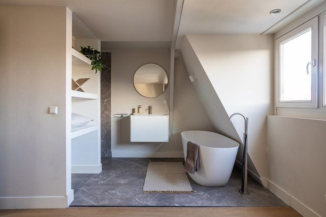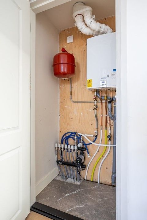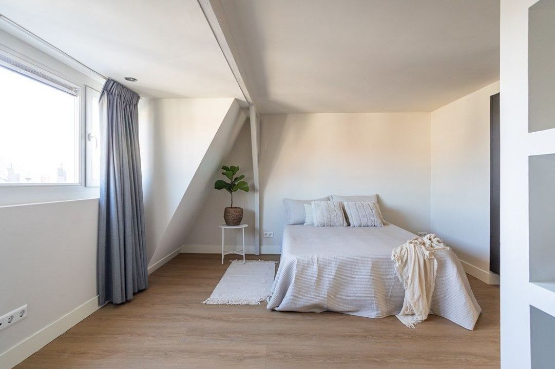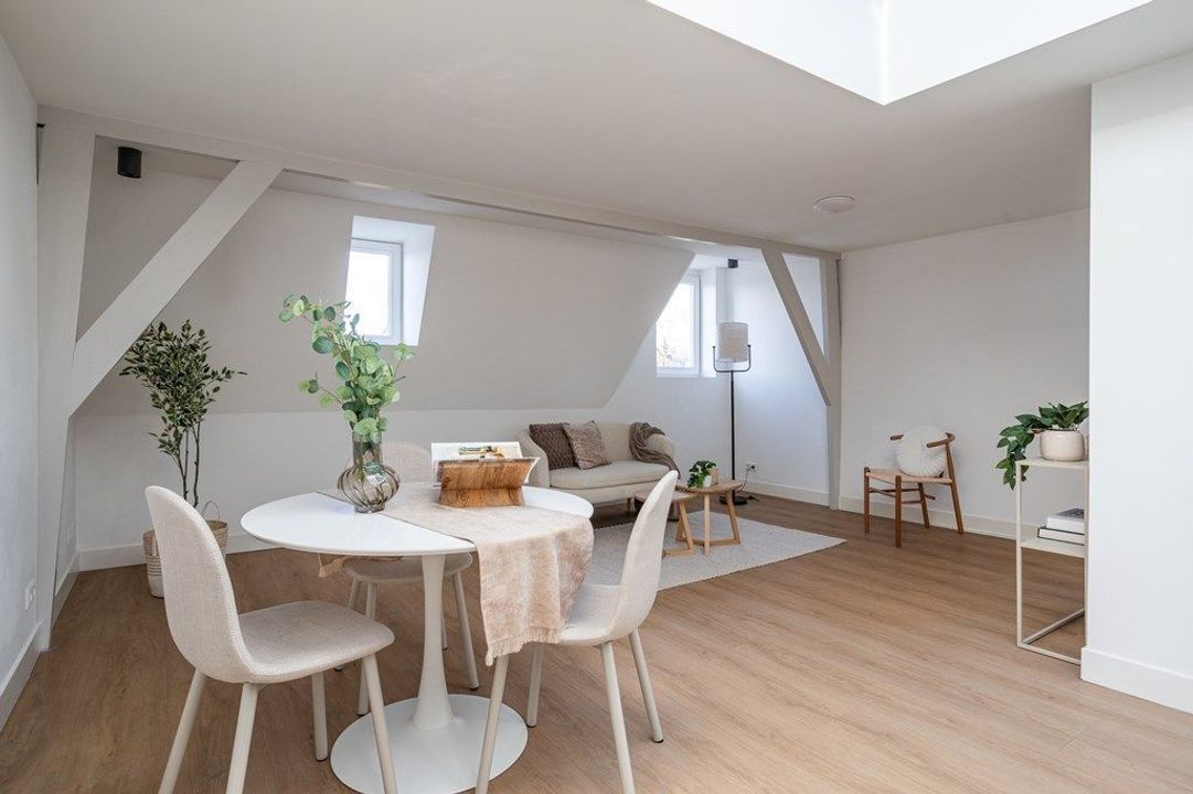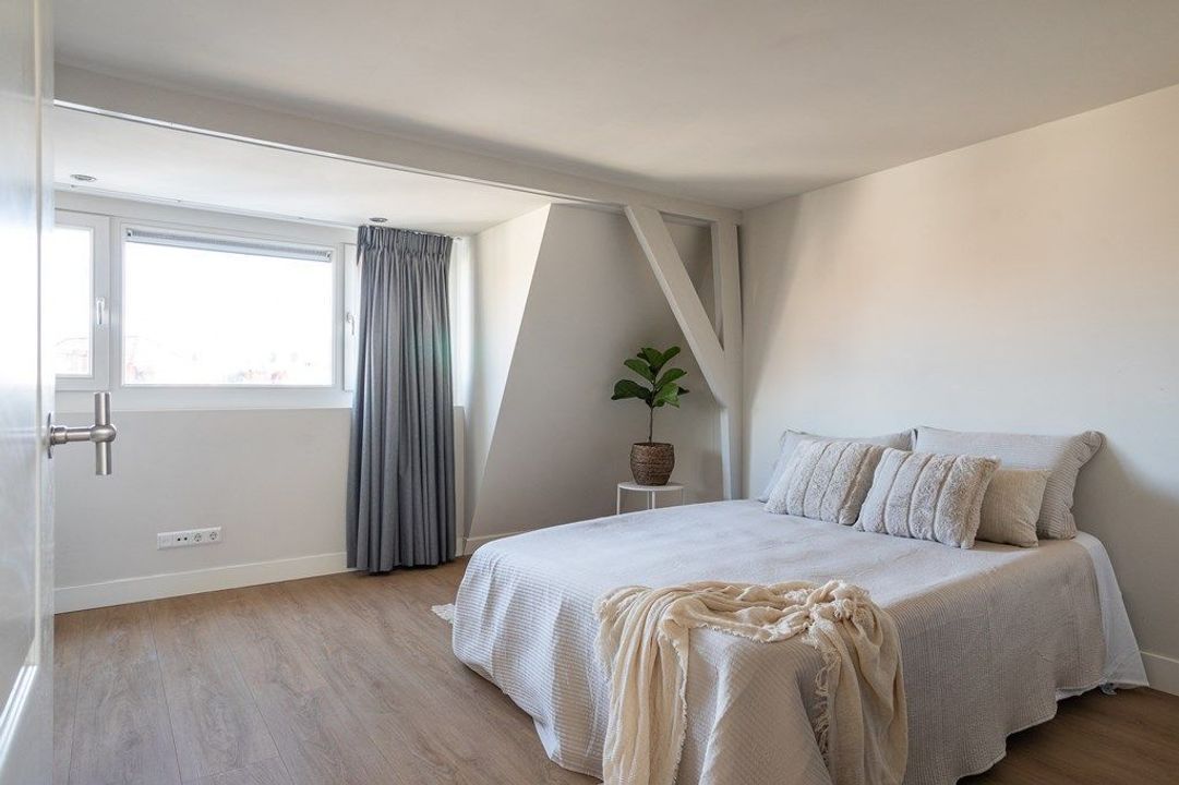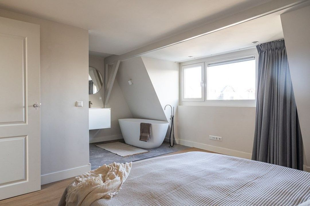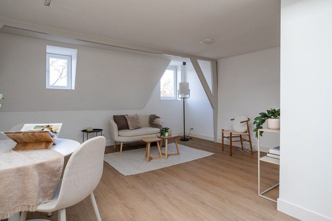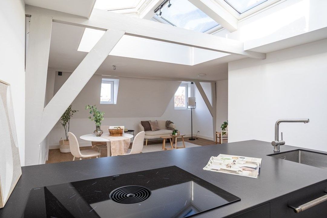 Central entrance at street level, hallway with meter cupboards, storage areas and stairwell. Stairs to the second floor, where the entrance to the apartment is located. Stairs to the third floor, leading to the spacious and bright living room, luxury open-plan kitchen with kitchen island, combination oven, dishwasher, and built-in fridge and freezer. At the rear is a generous bedroom with built-in wardrobe space, adjoining a luxury bathroom with bathtub and shower.