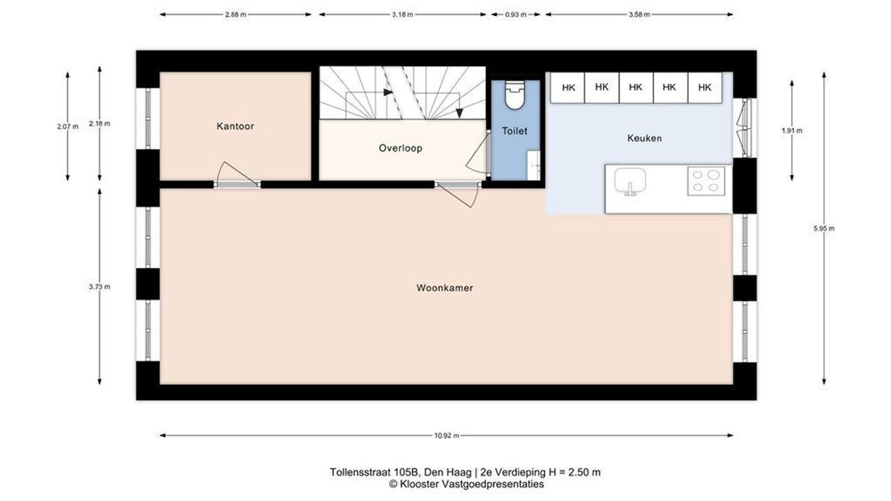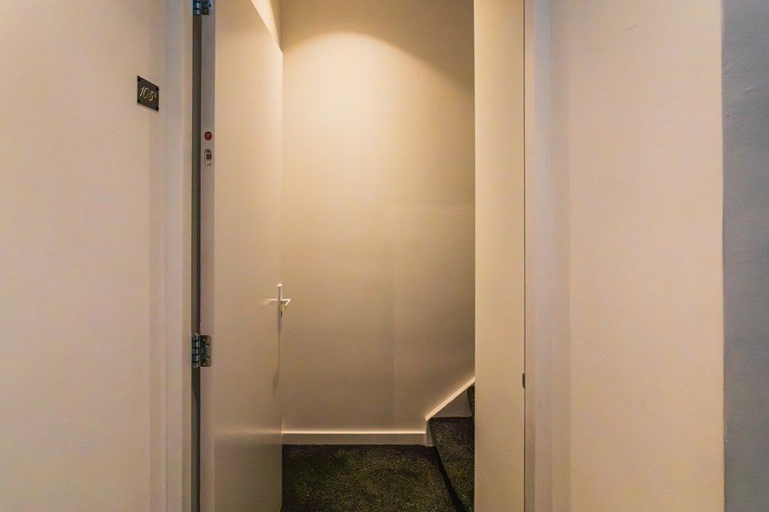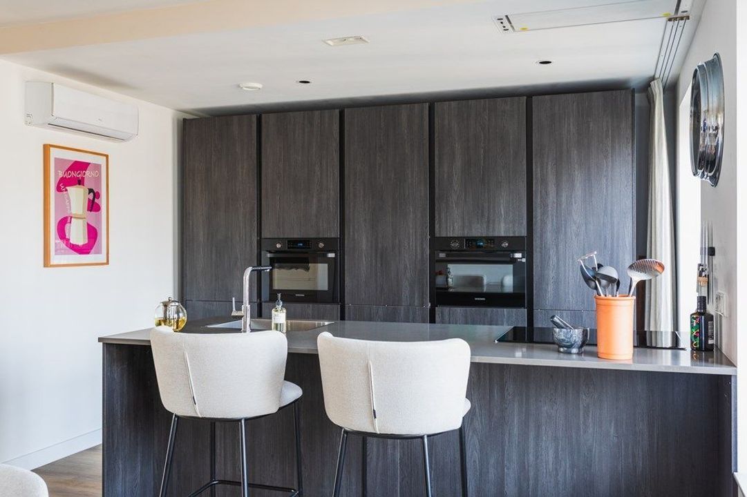 Via de entree op de begane grond en de gemeenschappelijke trap bereik je de eerste verdieping, waar het appartement een eigen opgang heeft. De originele spijlentrap leidt naar de woonverdieping, waar een ruime hal toegang geeft tot het modern afgewerkte toilet en de lichte woonkamer. Grote raampartijen zorgen voor een open en aangename sfeer, terwijl de strakke PVC-vloer met vloerverwarming het geheel een warme basis geeft. Aan de achterzijde ligt de open keuken met kookeiland, voorzien van een inductiekookplaat met geïntegreerde afzuiging, diverse inbouwapparaten en veel bergruimte. Aan de voorzijde bevindt zich een slaapkamer die momenteel wordt gebruikt als werkkamer/logeerkamer.