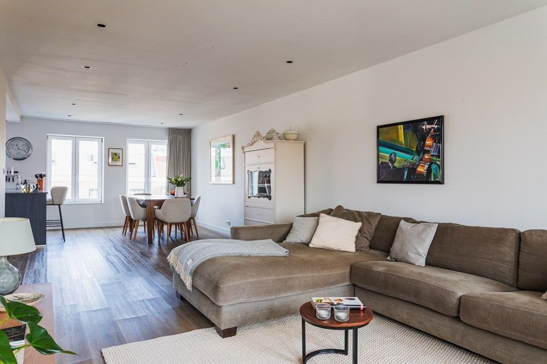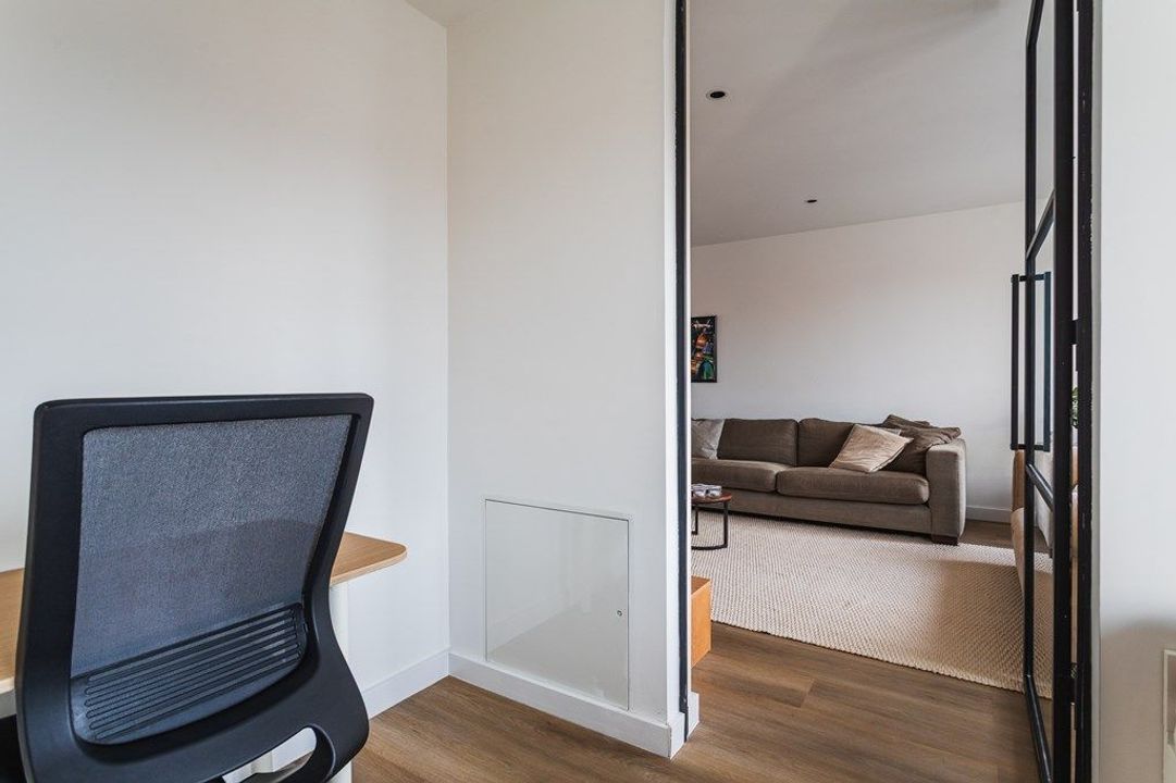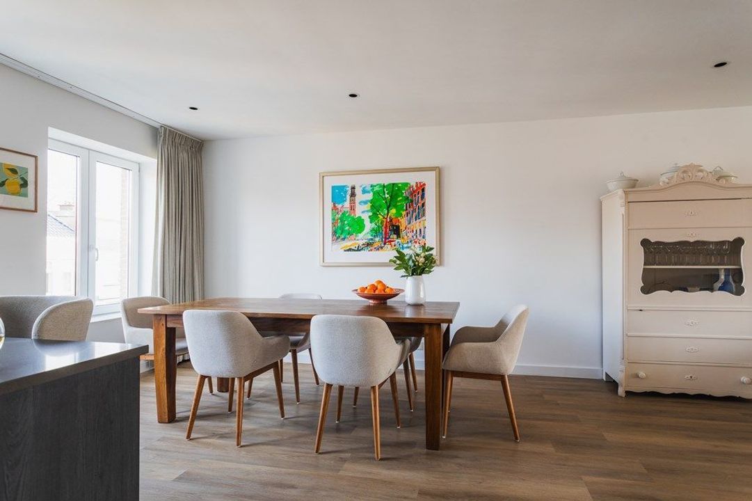 Via the entrance on the ground floor and the communal staircase, you reach the first floor where the apartment has its own private access. The original balustrade staircase leads to the main living level, where a spacious hallway connects to the modern toilet and the bright living room. Large windows create an open and inviting atmosphere, while the sleek PVC flooring with underfloor heating adds warmth and comfort. At the rear of the property lies the open-plan kitchen with a central island, equipped with an induction hob with integrated extraction, various built-in appliances and ample storage space. At the front, you will find a bedroom currently used as a home office/guest room.