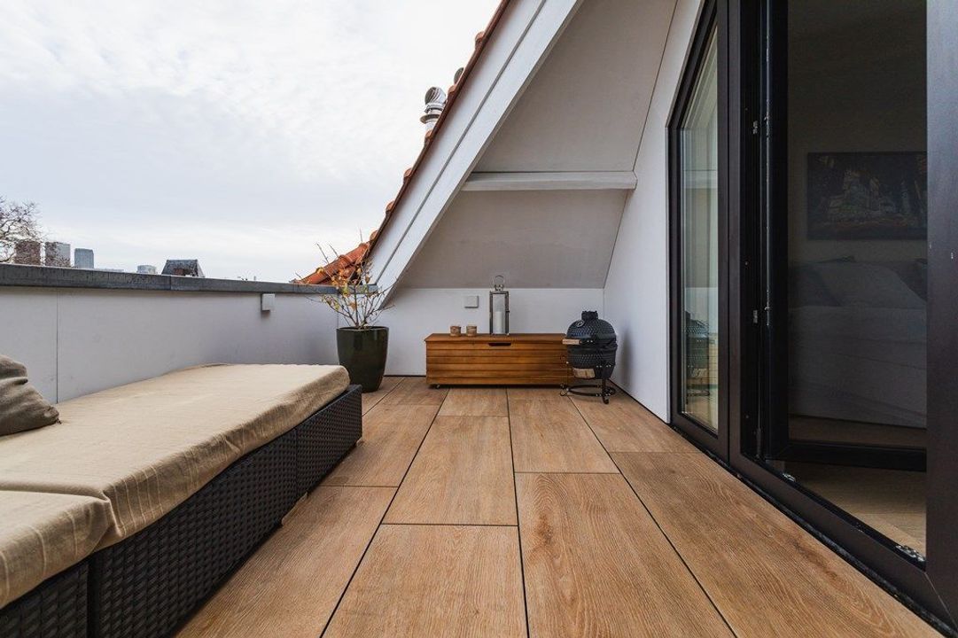 The top floor accommodates the spacious primary bedroom, directly connected to the contemporary bathroom featuring a bathtub, walk-in shower, second toilet and a stylish washbasin unit. The former third bedroom at the front has been transformed into a practical and spacious laundry room, making this floor exceptionally well organised for daily convenience. The primary bedroom also provides access to the roof terrace, where you can enjoy unobstructed views towards the historic city centre, the Palace Gardens and the Royal Stables — a unique and tranquil spot in the middle of the city.