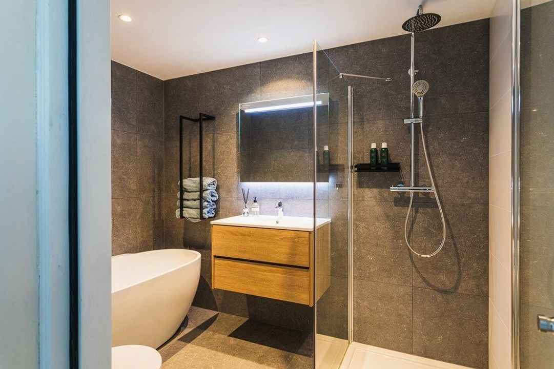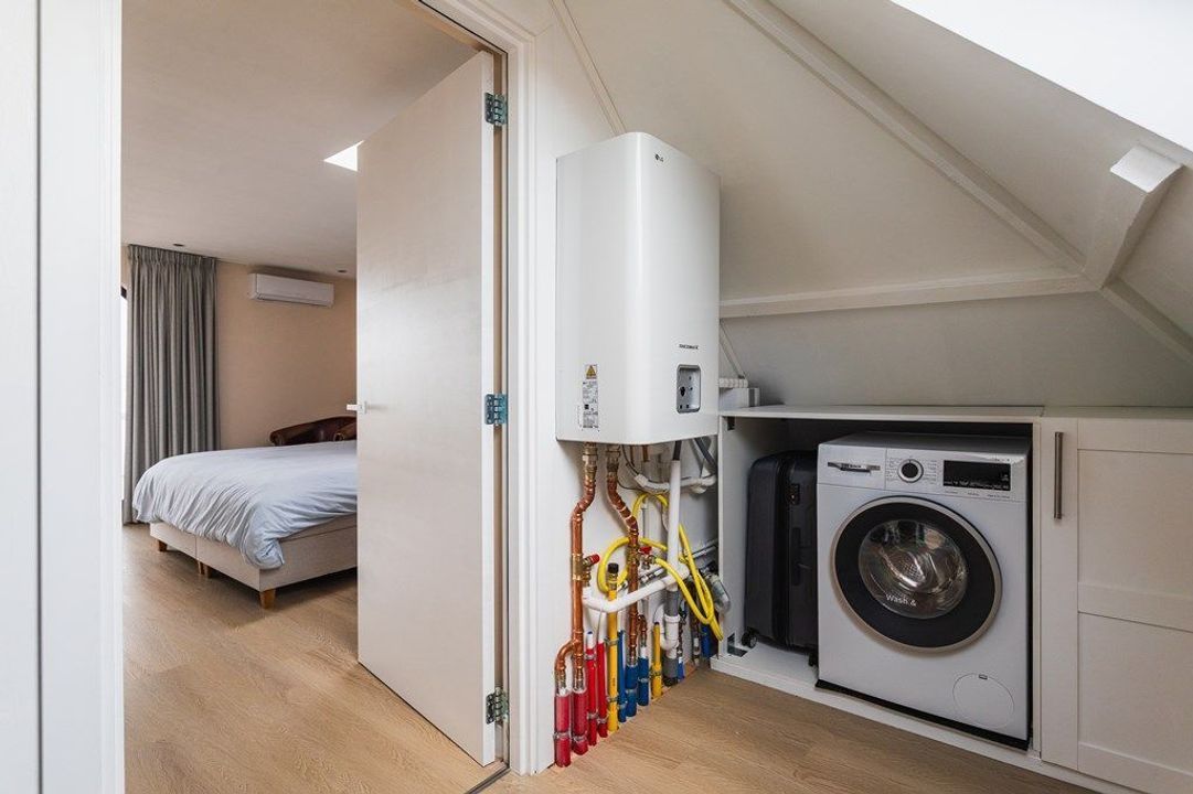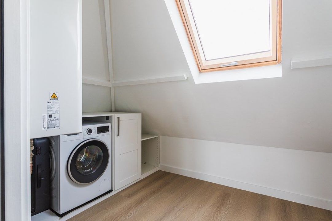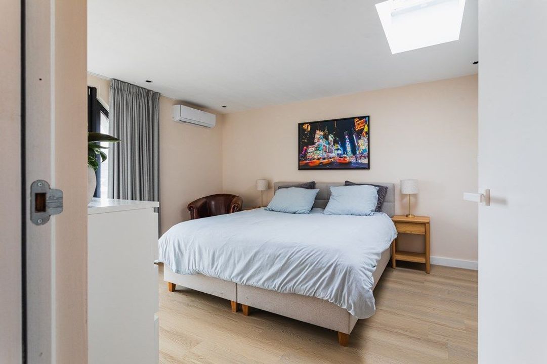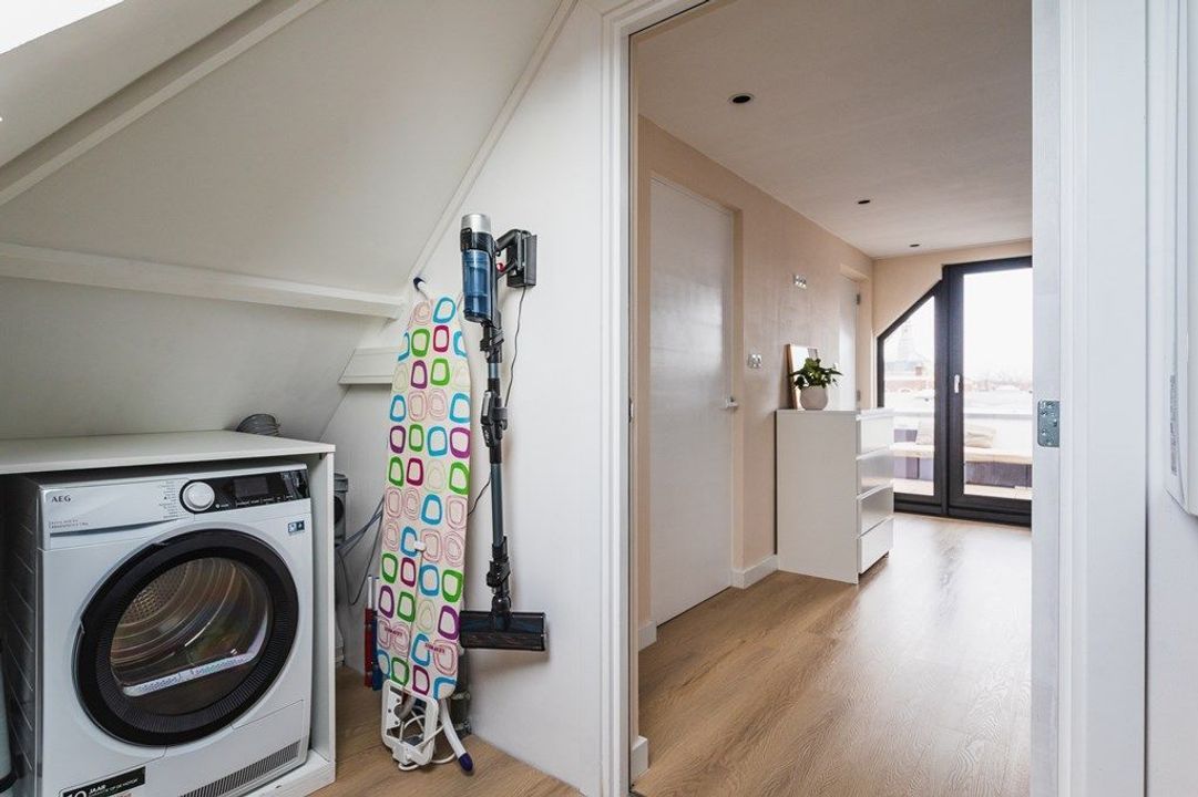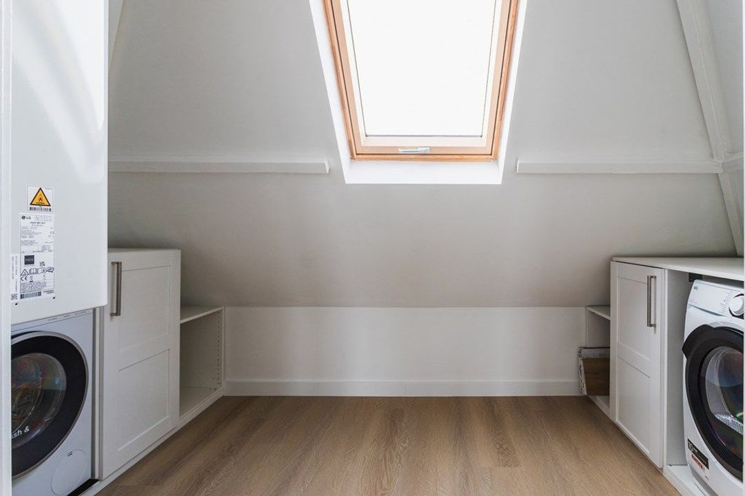 De bovenste verdieping biedt ruimte aan de royale hoofdslaapkamer, die direct is verbonden met de moderne badkamer met ligbad, ruime inloopdouche, tweede toilet en een stijlvol wastafelmeubel. De derde slaapkamer aan de voorzijde is momenteel tot een praktische en ruime waskamer, waardoor deze verdieping optimaal is ingericht voor dagelijks comfort. Vanuit de hoofdslaapkamer is tevens toegang tot het dakterras, waar je geniet van een vrij uitzicht richting het oude centrum, de Paleistuin en de Koninklijke Stallen — een unieke en rustige plek midden in de stad.