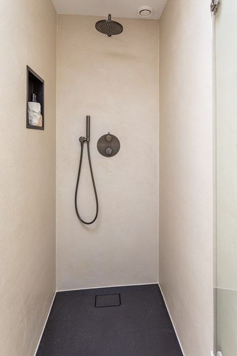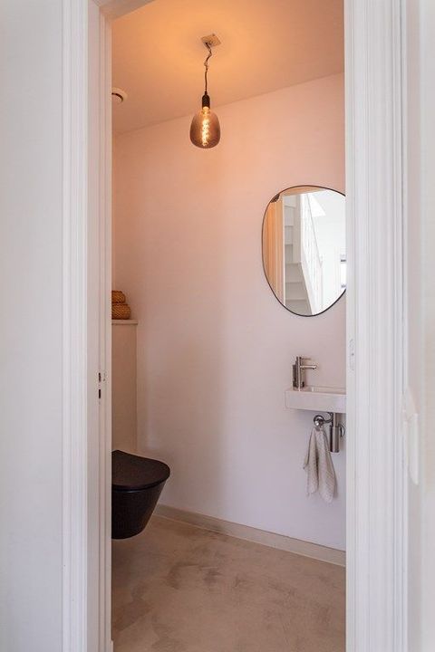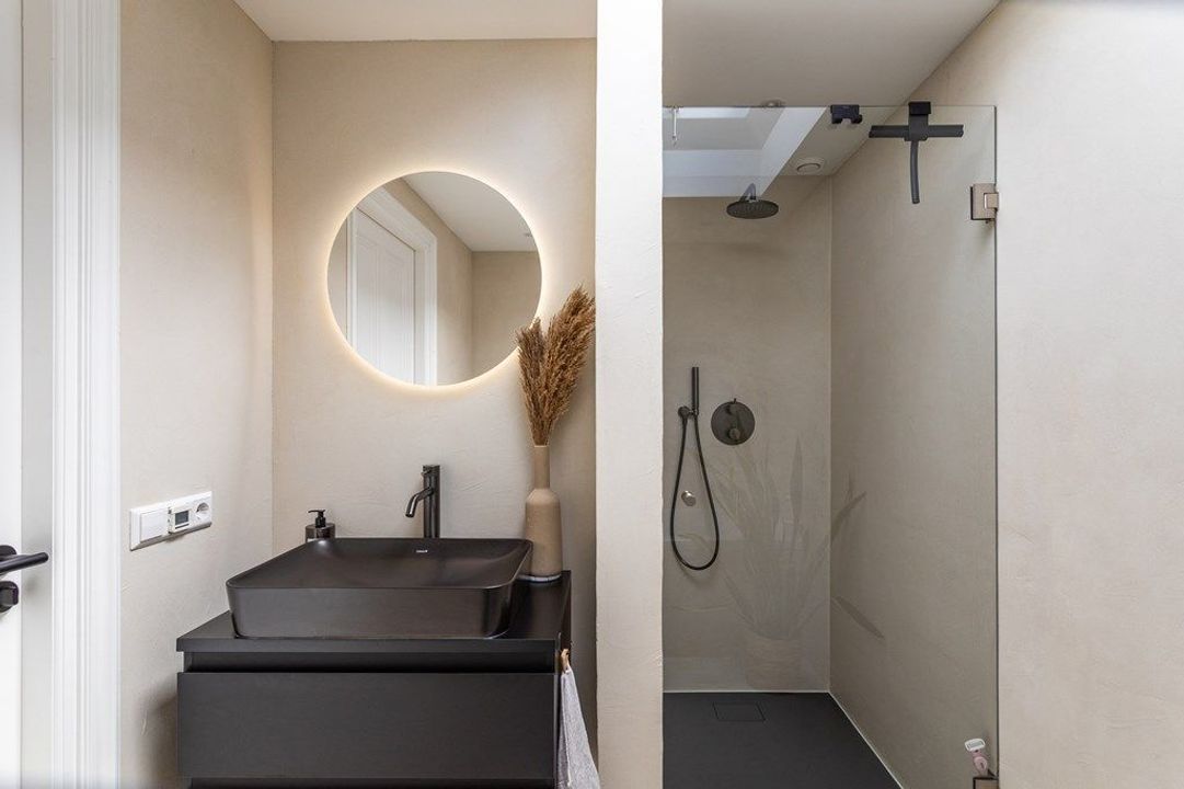 The third floor offers two generous bedrooms, a stylish bathroom with a bathtub, walk-in shower, concrete-look (beton ciré) walls, gun metal fixtures, and a custom vanity unit. There is also a second toilet, a separate laundry room, and extra natural light thanks to a new Velux roof window.