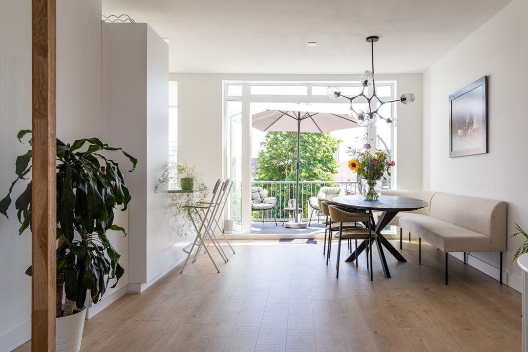 Private entrance on the first floor. Stairs lead to a spacious hallway on the second floor with a modern toilet and a versatile front room – ideal as a home office or guest bedroom. The heart of the home is the bright and spacious living/dining area with a luxury open kitchen, accessed through striking oak pivot doors. At the front, a cosy seating area overlooks the vibrant street scene; at the rear, the dining area opens onto a sunny southwest-facing balcony.
