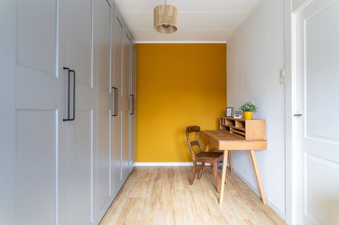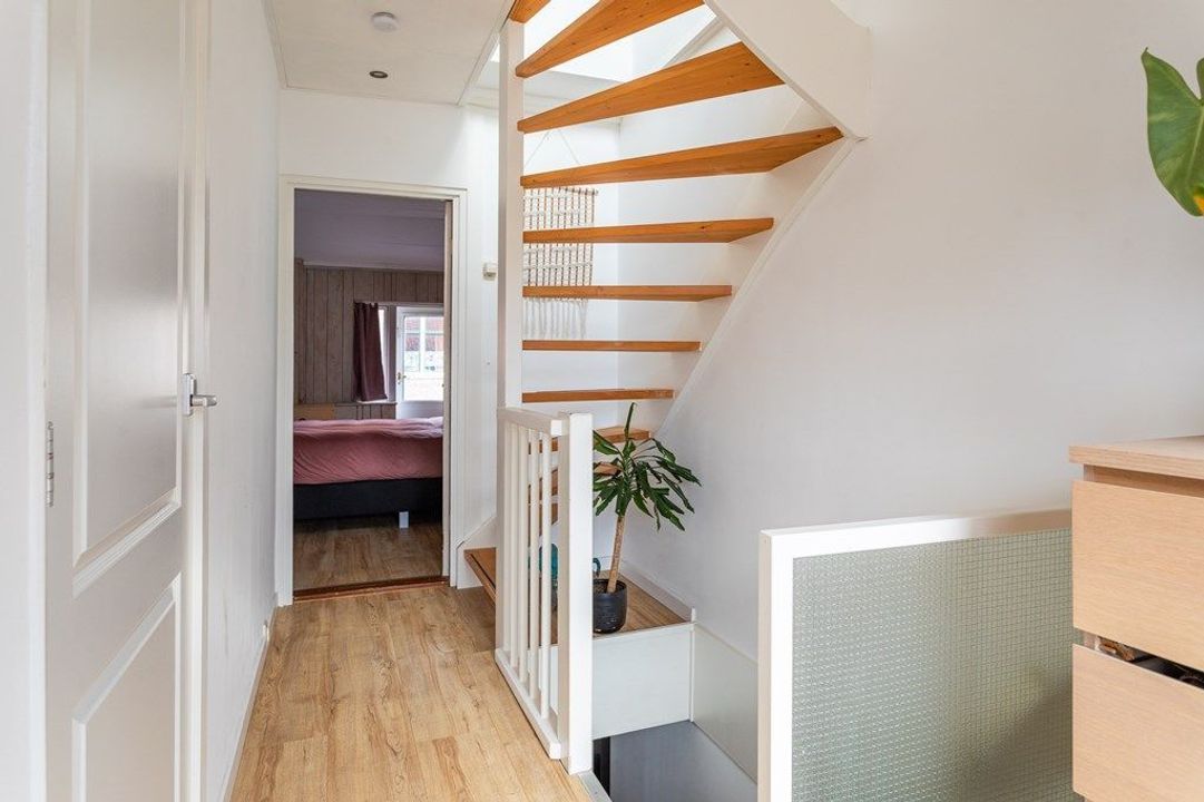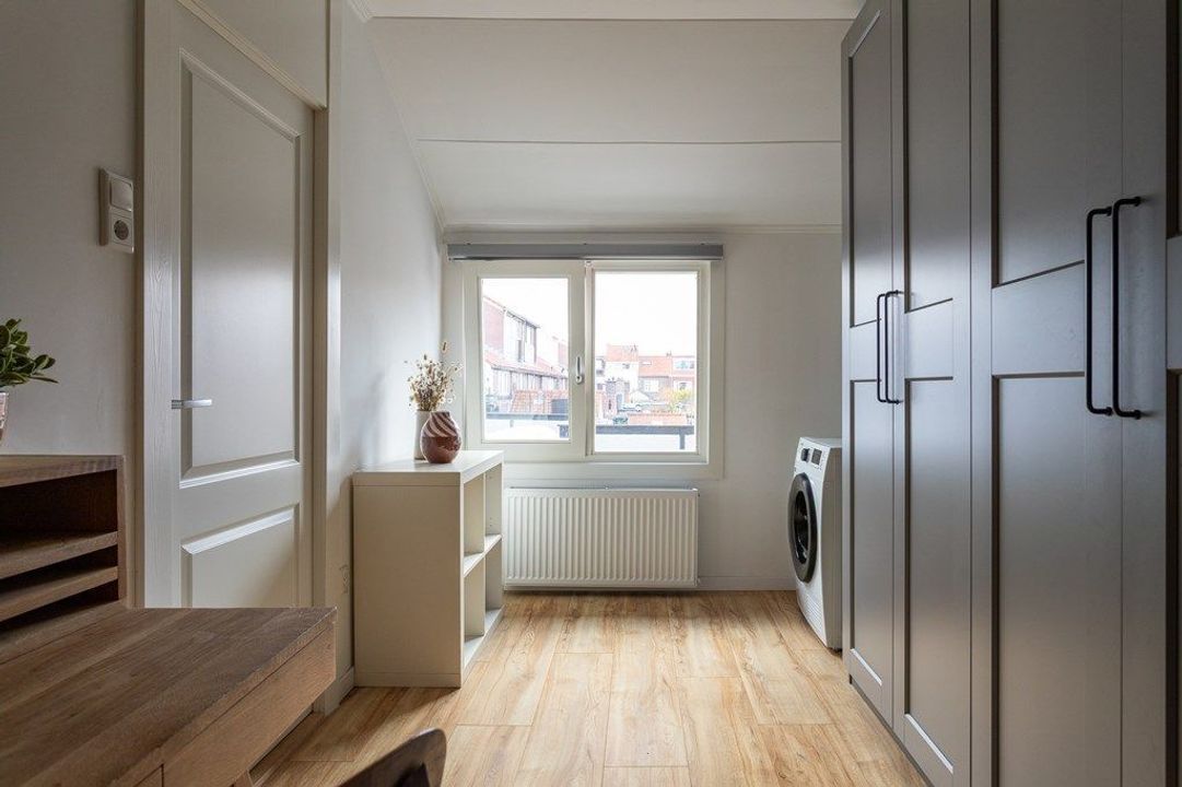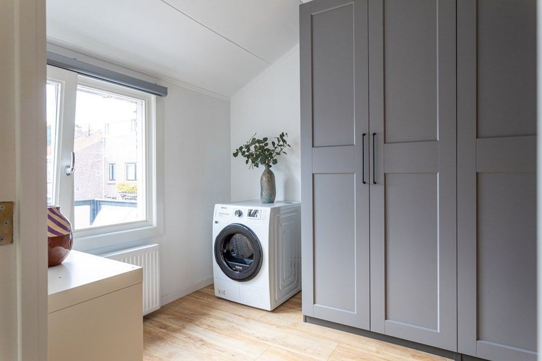 Op de eerste verdieping bevinden zich twee comfortabele slaapkamers en een lichte overloop die toegang geeft tot het ruime dakterras op het zuidwesten — een fijne plek om van de middag- en avondzon te genieten. In de slaapkamer aan de achterzijde vind je de opstelplaats voor de droger en wordt momenteel gebruikt als studeer/kledingruimte. De masterbedroom, te vinden aan de voorzijde van het huis, bevindt zich ook op deze verdieping.