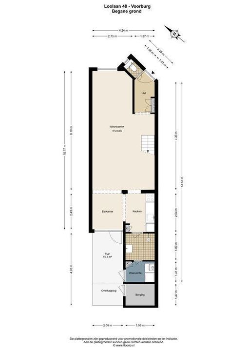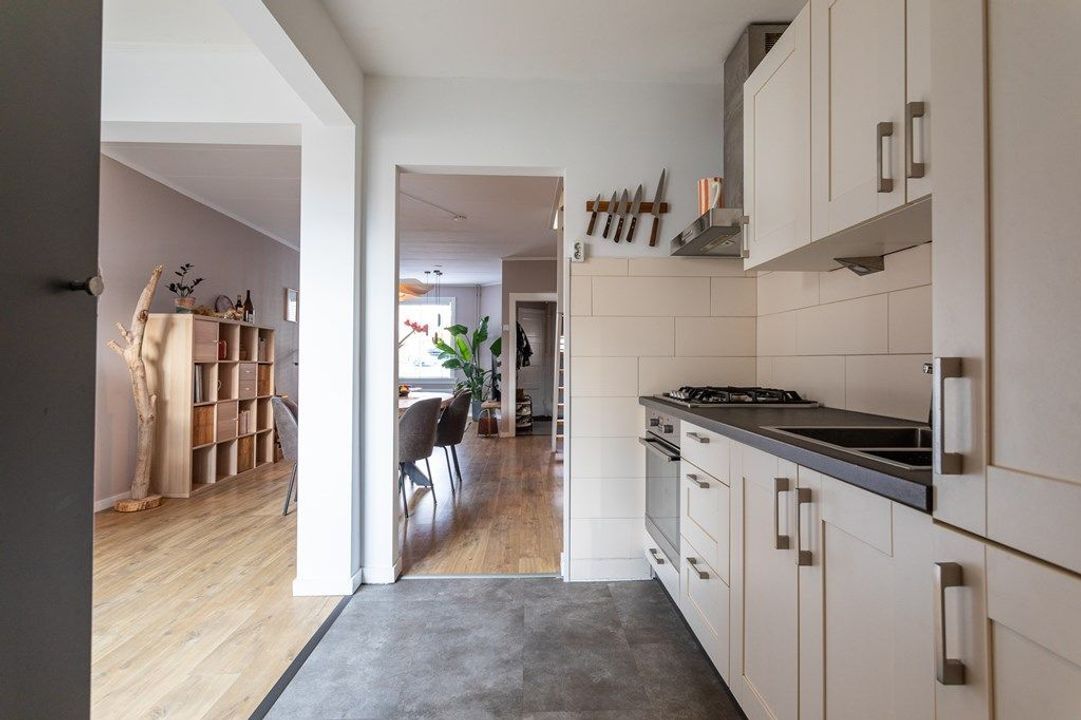 Via de entree kom je in de hal met toiletruimte en meterkast. Vervolgens stap je binnen in de lichte doorzonwoonkamer, met aan de achterzijde de eetkamer. Hier heb je direct toegang tot de achtertuin, die is voorzien van een achterom en een separate berging die alleen vanuit de tuin toegankelijk is. De moderne keuken grenst aan de eetkamer en is uitgerust met diverse inbouwapparatuur. Aansluitend bevindt zich de badkamer met douche en wastafel. Daarachter ligt een praktische wasruimte met aansluitingen voor de wasmachine, vaatwasser en ruimte voor extra apparatuur.
