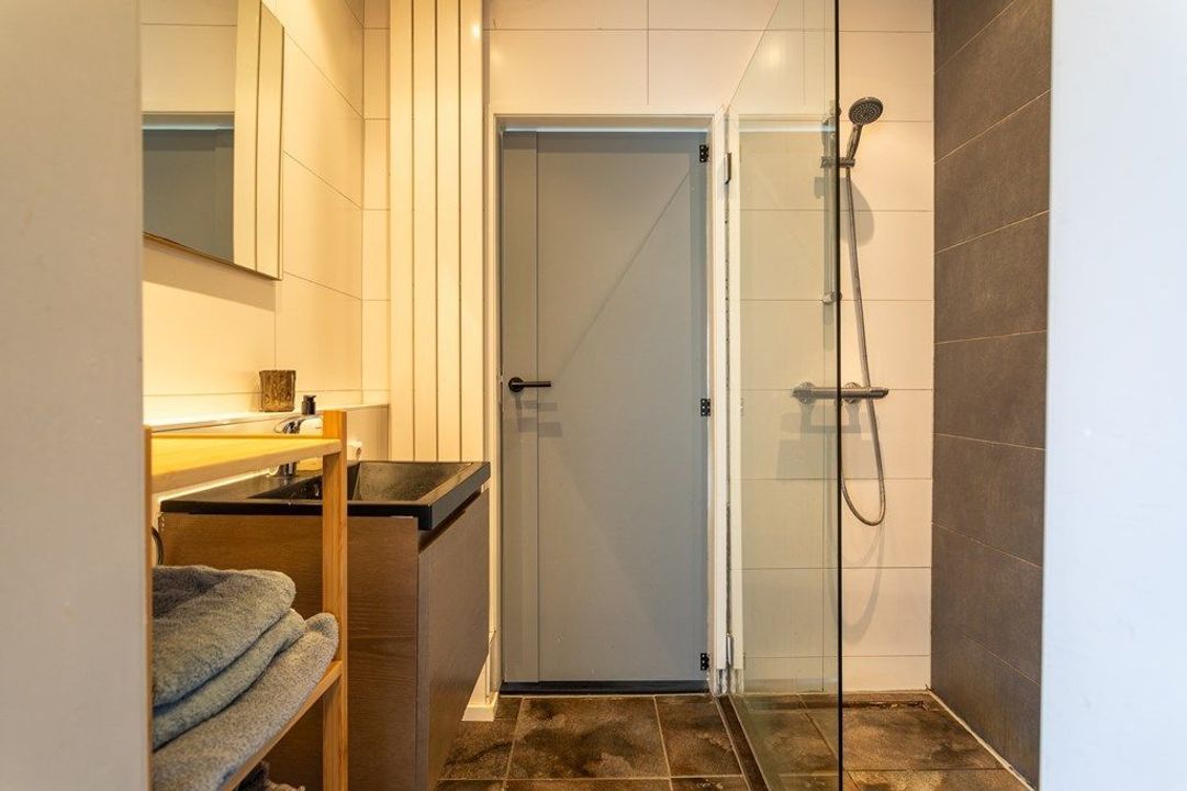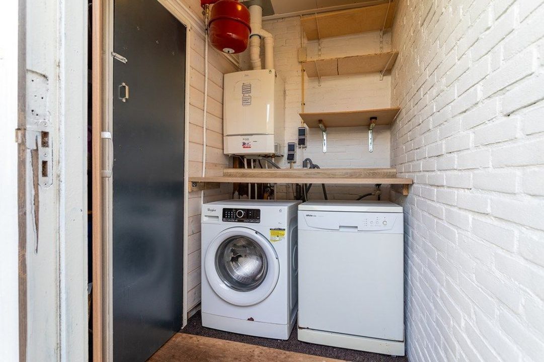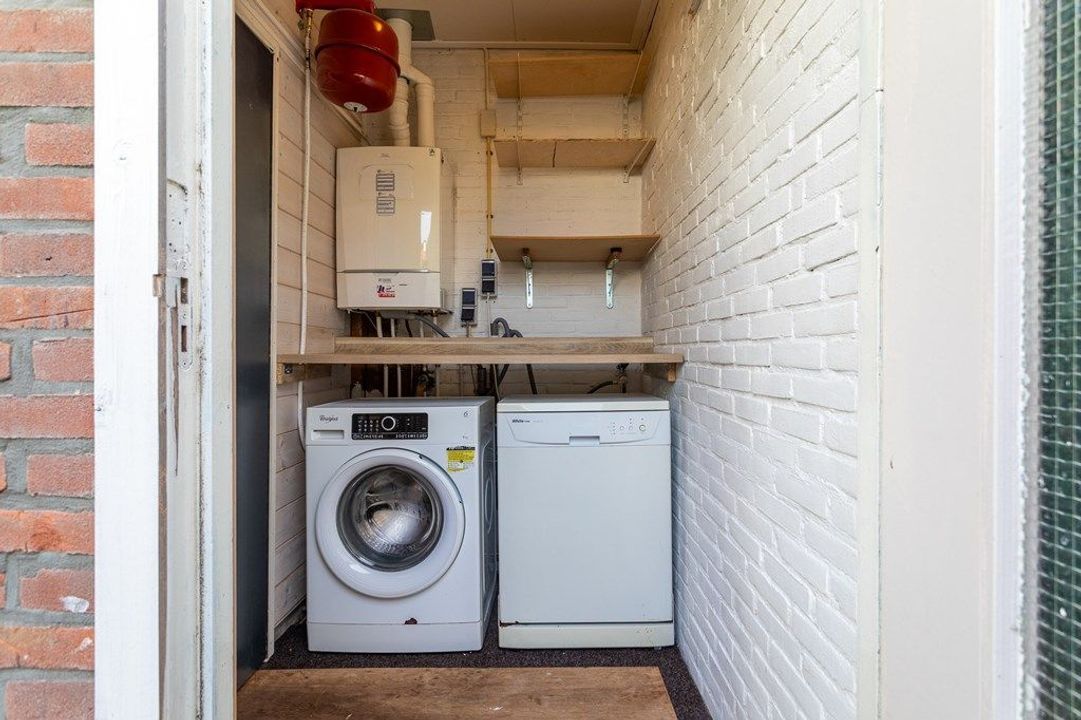 The entrance leads into the hall with a toilet and meter cupboard. You then enter the bright through-living room, with the dining area located at the rear. From here you have direct access to the back garden, which includes a rear entrance and a separate storage shed accessible only from the garden. The modern kitchen adjoins the dining area and is equipped with various built-in appliances. Next to the kitchen is the bathroom, fitted with a shower and washbasin. Behind the bathroom is a practical utility room with connections for the washing machine, dishwasher and space for additional appliances.